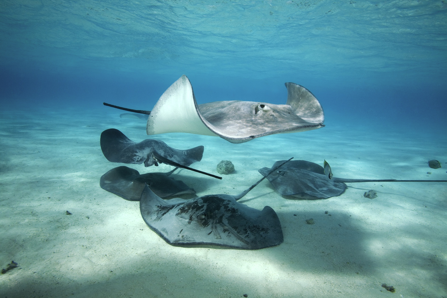 The uniformly gray backed Himantura stingrays are numerous in Moorea lagoon. They are 1 of the 5 ray species present in Polynesia : the pelagic rays - leopard (fai manu), manta (fafapiti), mobula (fafarua) - adapted to swimming in the open water thanks to their wings-like fins and the rays living on the sandy lagoon bottoms and reef outer slopes such as the marbled ray (fai puka) and stingray (fai i'u). The stingrays feed on crustaceans, molluscs, worms buried in the sand which they dislodge by creating a jet of water with their mouths.