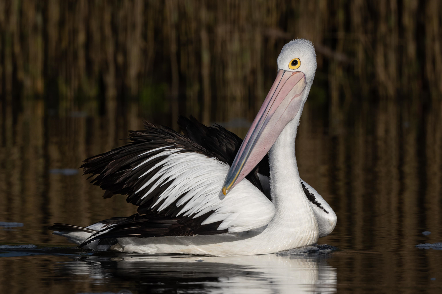 It measures 50 centimeters. The Australian Pelican (Pelecanus conspicillatus) has the largest bird beak in the world. This imposing attribute allows this water bird to catch many fish. The Australian Pelican has yellow skin that surrounds its black eyes, which takes the shape of a pair of glasses. It measures on average 2.50 meters and lives in the Indo-Pacific basin.