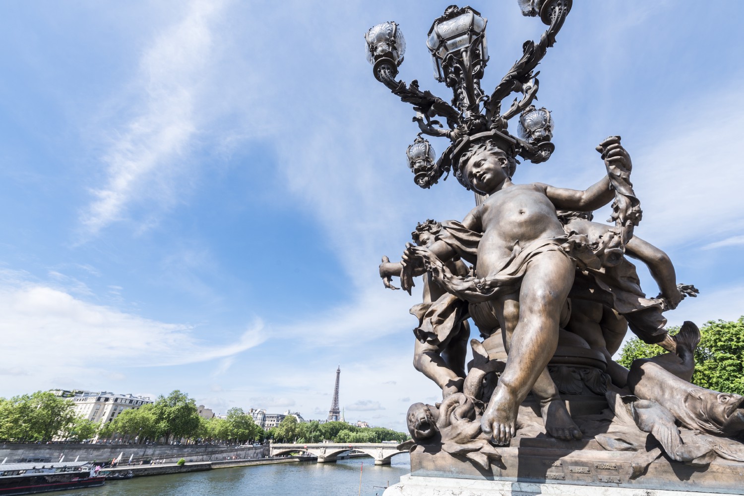 The Alexandre-III bridge is lit by 32 bronze candelabras, manufactured by the art foundry Lacarrière Delatour & Cie. The balustrades each support 14 three-branched lights, decorated alternately with a cockerel for France, a boat for Paris, a two-headed eagle for Russia. At both ends of the bridge, near the pylons, stand 4 five-branched candelabras. The columns of the latter are decorated with a ‘Ronde d’Amours’ (round of Cupids), sculpted by Henri-Désiré Gauquié (1858-1927) and cast by the Thiébaut Foundry. The bronze cherubs bear garlands and dance among river fish.