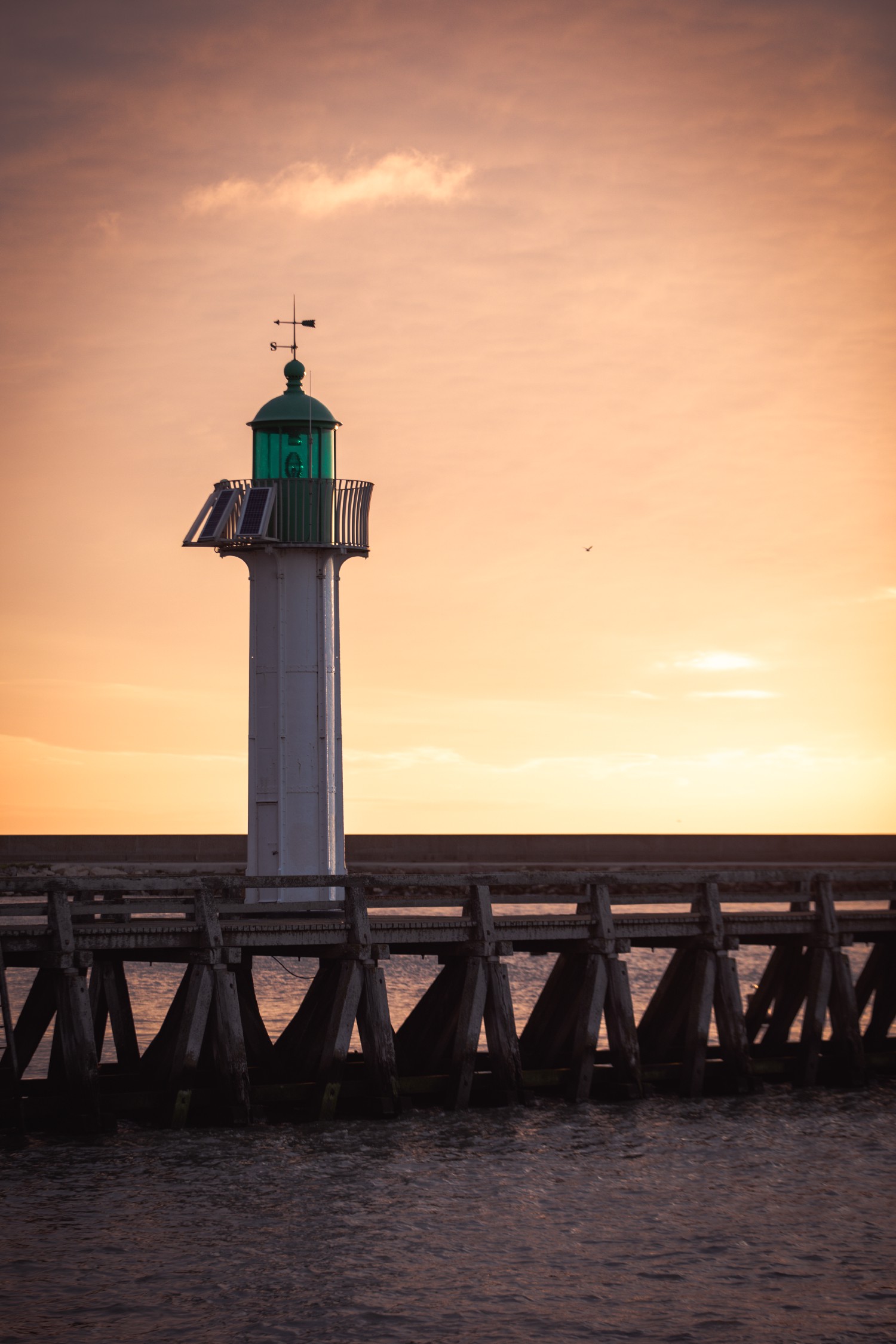 A channel, flanked by two wooden piers, opens onto the outer harbor of Trouville-Deauville in the Calvados department. This outer harbor precedes the yacht basin and the wet basin, both closed by locks surmounted by movable footbridges. Extended several times in the second half of the 19th century in an attempt to avoid the silting up of the channel, the piers ending in a red light and a green light (photo) were originally made of oak. In 1868, the contractor Antoine Mauger replaced the oak with rot-proof beech for their submerged parts and red fir from Sweden and Norway for their emerged parts.