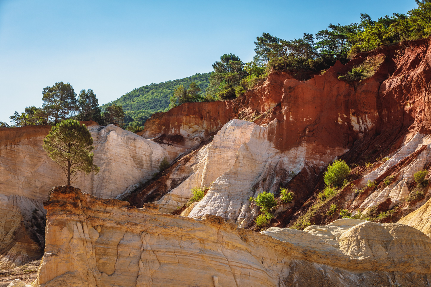 The Luberon ocher shaping process began around 110 million years ago. Sedimentary formations of sands and organic debris enriched in iron were deposited at the bottom of the shallow sea that then covered Luberon. Once these formations emerged, the iron oxidized and crystallized under the effect of the tropical climate of the time to form goethite and later limonite and hematite over successive alterations and oxidations that created the distinctive range of colors of the ochers.