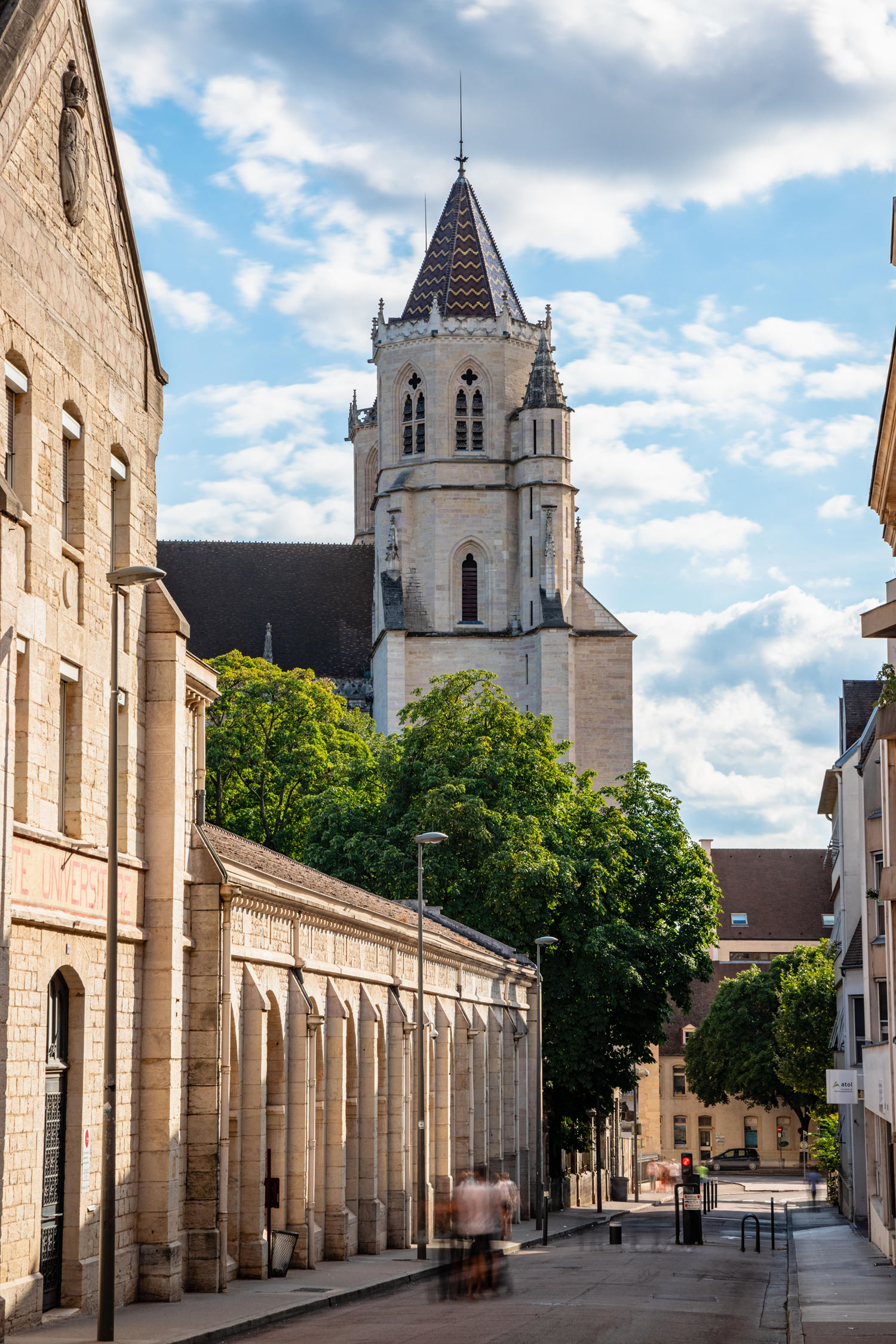 Renowned for its picturesque facade screen unique in France, Notre-Dame de Dijon Church was initiated in 1220 and finished in 1240. Its style, comparable to that of contemporary religious monuments in Laon, Auxerre, or Soissons, straddles the classical Gothic (1220) and Flamboyant Gothic (1230) periods. From 1865 to 1884, the church underwent significant modifications, particularly at the level of the crossing tower that was surmounted in 1873 by a slate spire much higher than the previous bell tower and surrounded by elegant turrets. The current 274 ft (83.60 m) high bell tower was again restored using slates from Angers and Fumay (Ardennes) at the end of the 1960s.