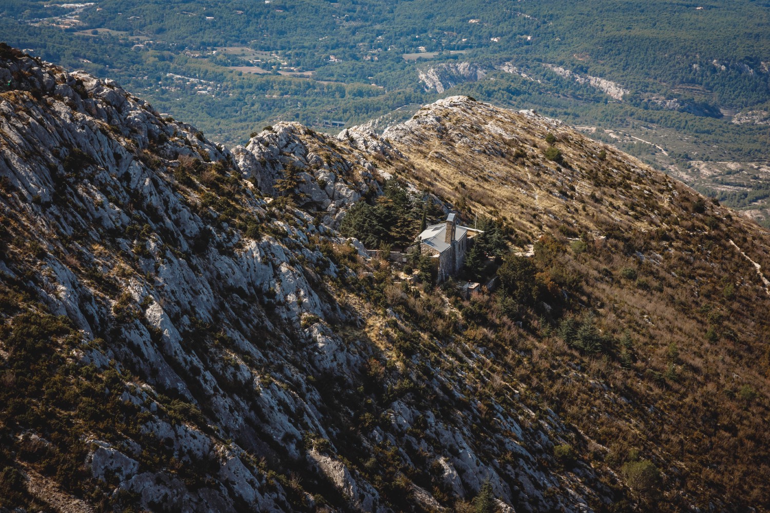 The construction of the current chapel consecrated to the Virgin Mary under the name Notre-Dame-de-Victoire began in 1657 and ended in 1661. Its location a few meters from the top of the Sainte-Victoire mountain complicated its edification. It was first necessary to create a genuine network of paths serving the neighboring municipalities both north and south of the mountain to supply the site. The usual so-called Venturiers path followed by the pilgrims over an elevation gain of about 1,968 ft (600 m) to reach Sainte-Venture Chapel was indeed too winding, narrow, rocky, and steep to transport the necessary materials on donkeys or mules.