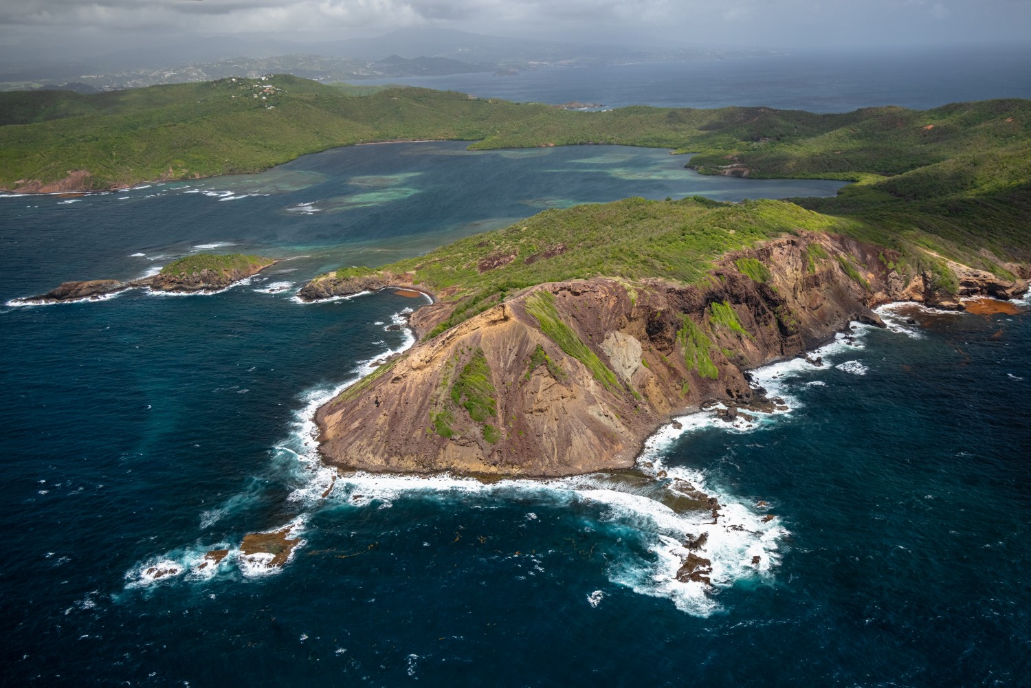 Approached here via its eastern Atlantic facade at the level of the Caravelle peninsula, Martinique emerges in the center of the island arc of the Lesser Antilles. The area constitutes the eastern limit of the Caribbean plate by subduction of the Atlantic plate under the Caribbean plate since the Oligocene. The location of Martinique in the center of the island arc at the level of the convergence of the two northern arcs explains the continuity of the volcanic activity of the island since the Oligocene, without major hiatus nor superposition of products. From east to west and from south to north, there is therefore a complete succession of volcanic units, from the products of the ancient arc visible here on the Caravelle peninsula to the recent products of Mount Pelée. The geological interest of Martinique lies in the fact that the ancient products that outcrop there are accessible because they are not covered by more recent limestone or volcanic deposits.