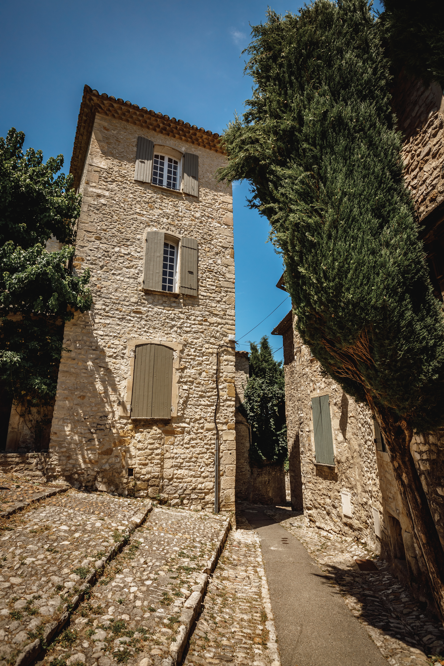 The main streets of the upper town of Vaison-la-Romaine, established in the Middle Ages on the left bank of the Ouvèze river, have mostly been laid out against the slope. This decision aimed to facilitate the traffic and the establishment of mansions to accommodate the noble and bourgeois families. Linking the Place du Vieux Marché to the west to the Place de l'Église to the east, these streets have been cobbled and paved with river pebbles recovered from the Ouvèze.