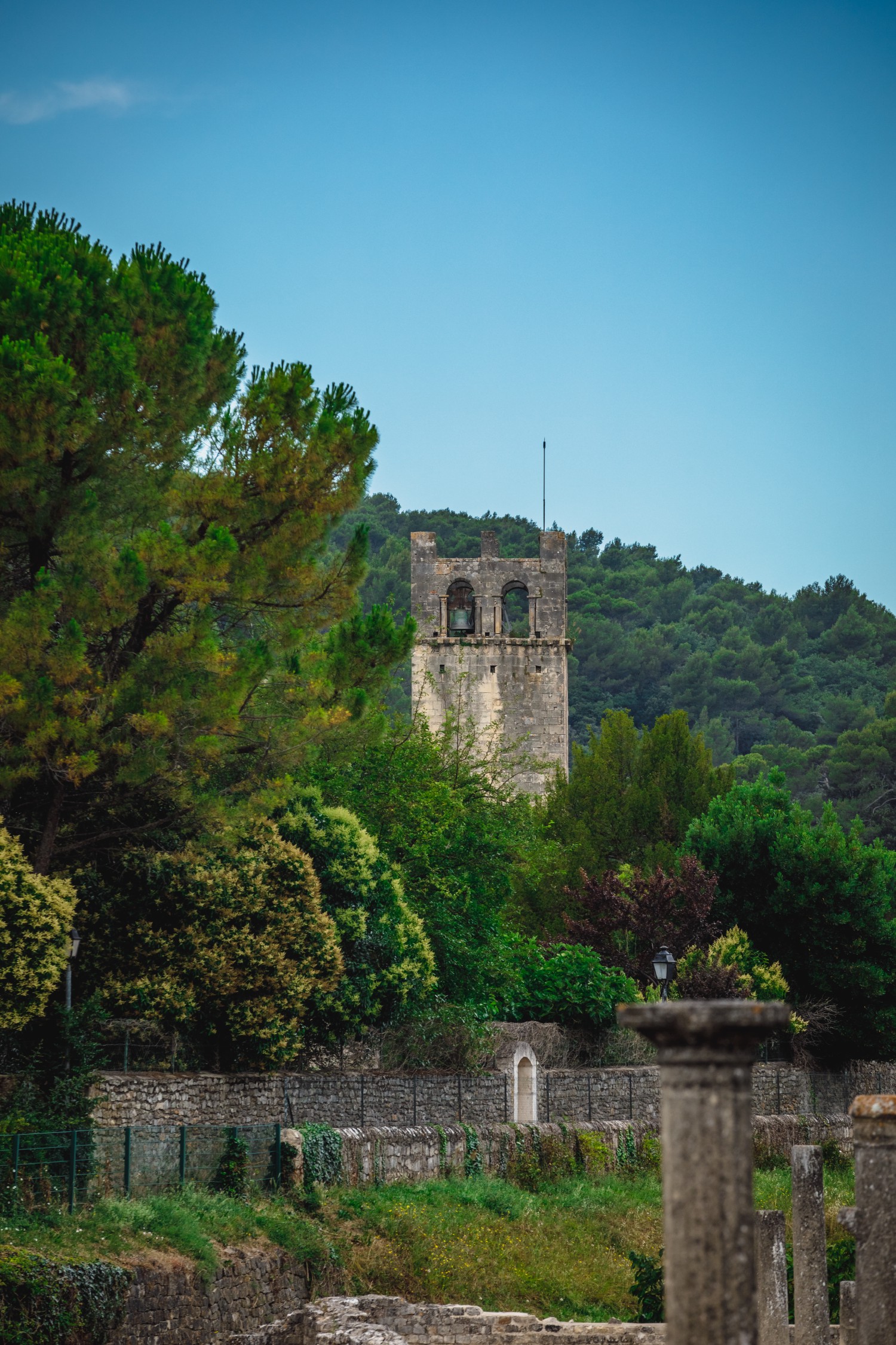 The crenelated square bell tower of Notre-Dame de Nazareth Cathedral in Vaison-la-Romaine rises above the last span of the north aisle against the northern apsidole. Its upper part is pierced with putlog holes and decorated with a frieze of foliage, a cornice with corbels, and openings with small columns. The funerary cippus with a portrait of Publius Atilius Ingenuus is embedded in the eastern face of the bell tower.
