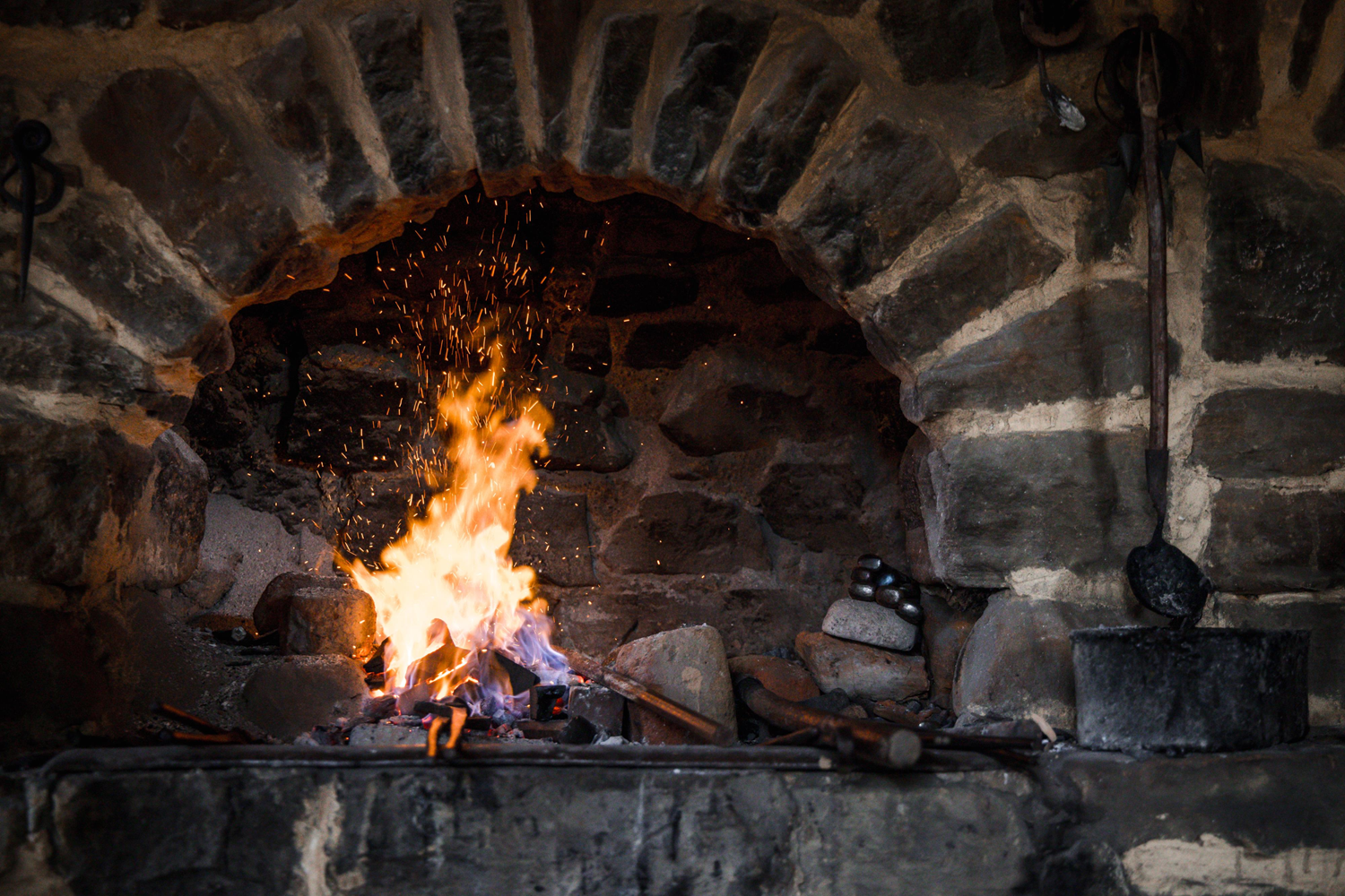 The forge of the blacksmith's workshop of the Guédelon medieval construction site in the Yonne department was redone in 2004. As the blacksmith's fire is permanently lit, its stone hearth was reinforced with buttresses, while the workshop's roof was adorned with chestnut shingles. Such wooden tiles are highly resistant and can last over a century. The wide leather bellow of the forge was renovated in 2003 as it was 200 years old. The blacksmith's anvil dates from the 15th century and consists of nine blocks welded together.