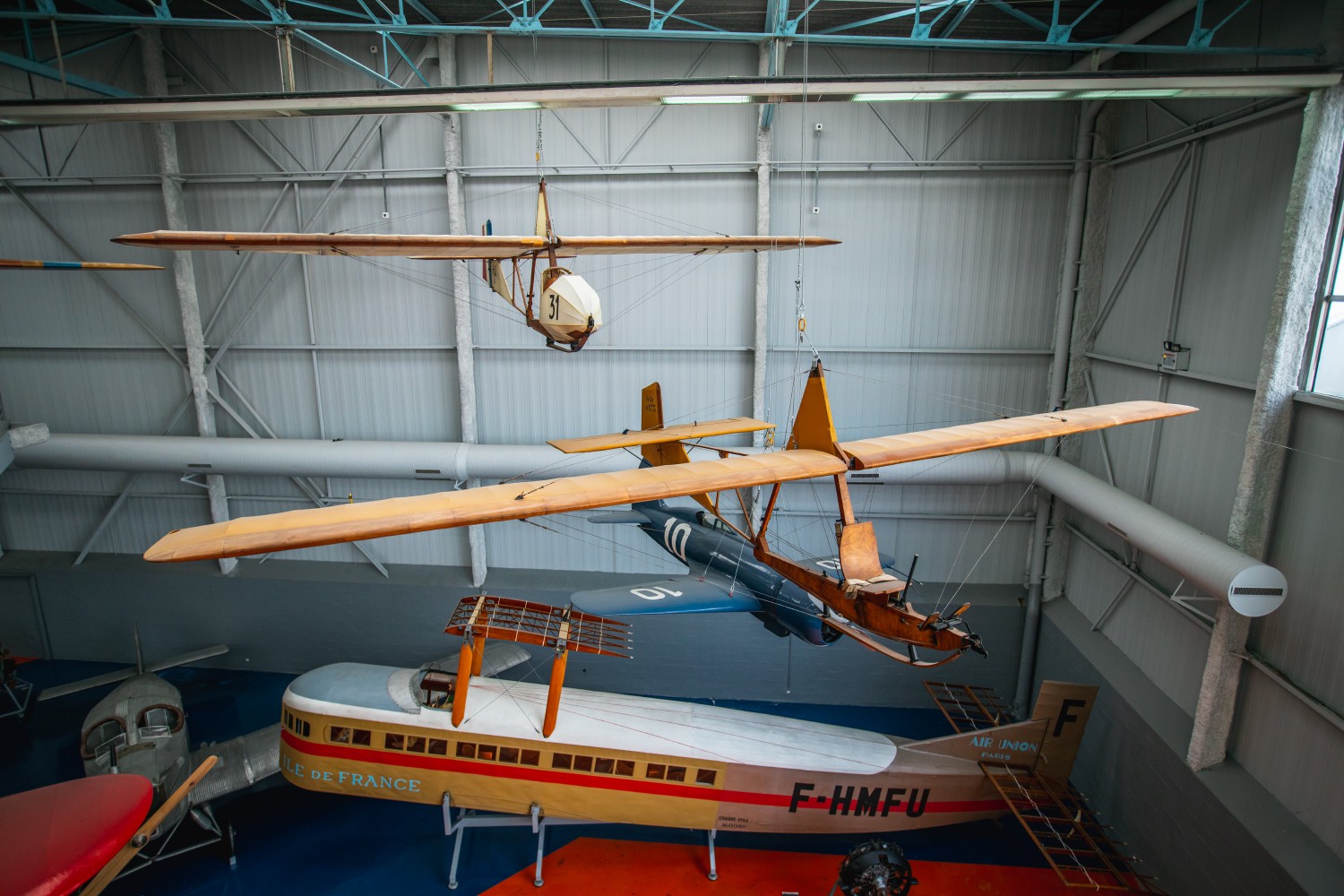In the centre of the picture, a Schneider Schulgleiter SG-38 training glider built in 1938 for the training of Luftwaffe pilots. Very light, the glider was launched by bungee cord from a sloping hill for a flight of a few tens of seconds. The apprentice pilot was alone on board and immediately confronted with the lift and steering. The SG-38 is the most widely built beam glider of the 20th century, with nearly 10,000 built. Nowadays, the SG-38 is still very popular in Germany and many replicas still fly in flying clubs.