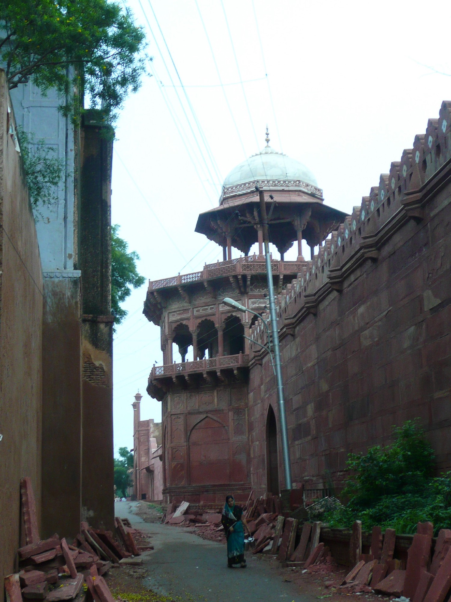 Le Taj Mahal est situé au fond d'un jardin ornemental rectangulaire clos par une enceinte percée sur chaque côté de quatre portes dont trois sont fausses.