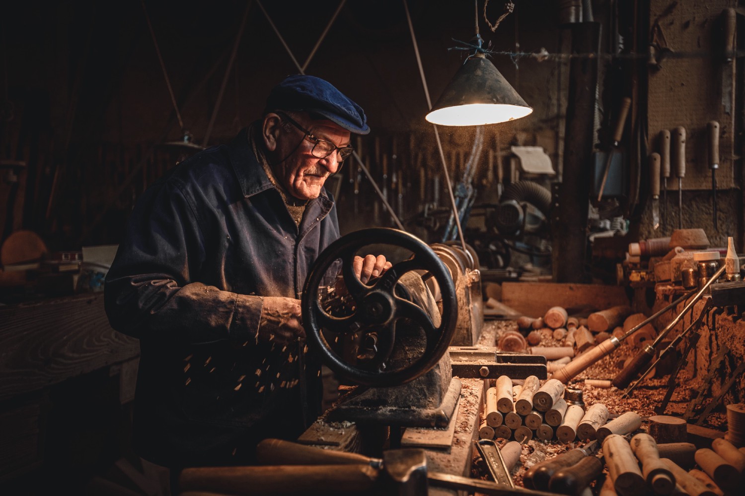Robert Marichy's wood-turning workshop is an institution in Arinthod, in the Jura department. He is one of the last turners to perpetuate this ancient Franche-Comté tradition, and his workshop has been established for 84 years. The only modern element is the electric lathe whose cast-iron pulleys and leather straps are fixed to the ceiling and driven by an engine. Robert Marichy claims that they are original and still work. The rest of his craft lies in three generations of know-how.