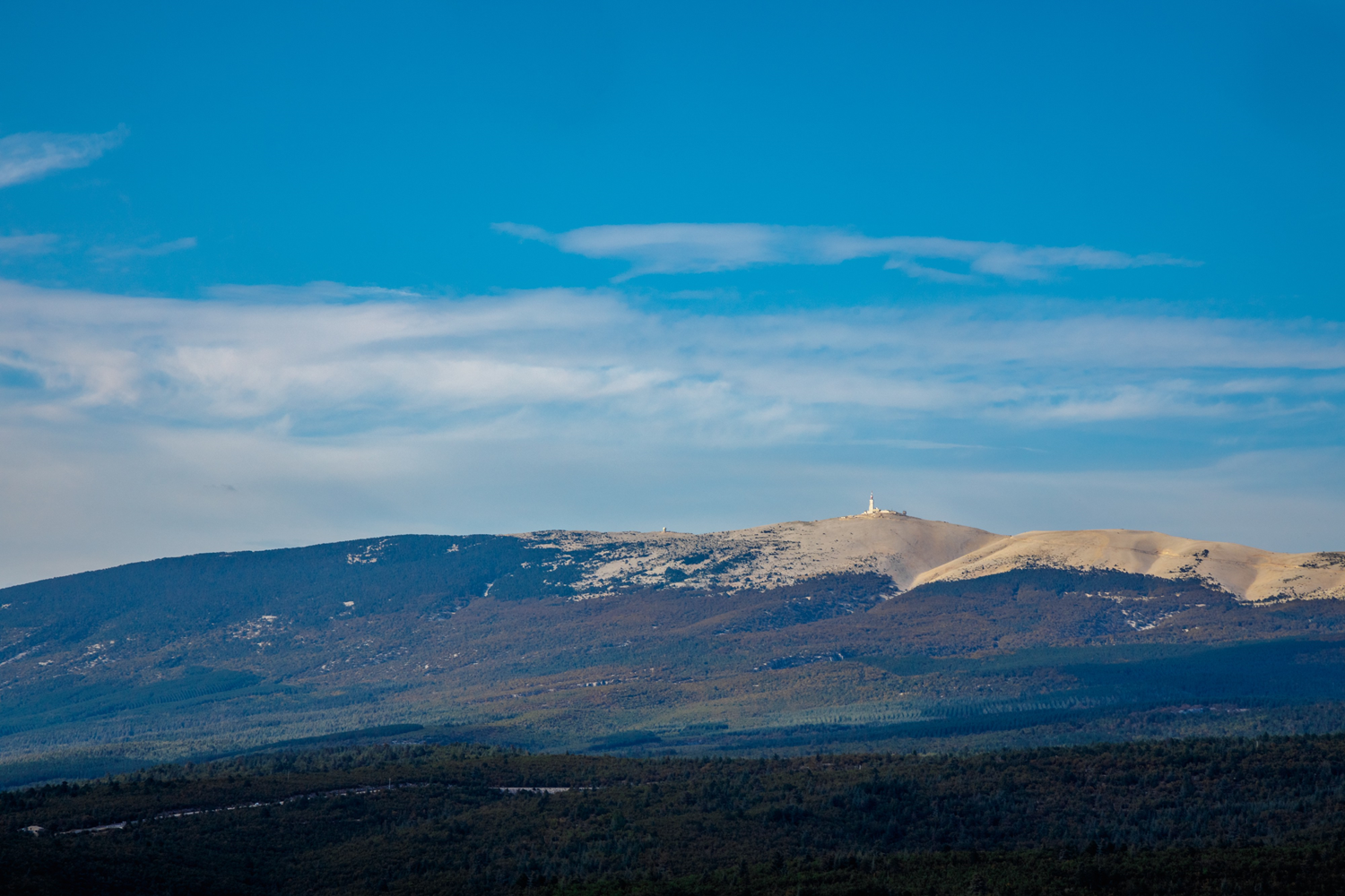 Mont Ventoux, also nicknamed the Giant of Provence or Mont Chauve, stretches about 15.5 mi (25 km) in length along an east-west axis and 9.3 mi (15 km) in width from north to south, representing a total area of approximately 64,250 acres (26,000 ha). Its geographical isolation and its white color linked to its essentially limestone nature make it visible over great distances. Located less than 12.4 mi (20 km) as the crow flies northeast of Carpentras in the Vaucluse department, its massif made up of several passes and steep slopes is spread over the territory of the eleven municipalities of Aurel, Beaumont-du-Ventoux, Bédoin, Brantes, Flassan, Malaucène, Monieux, Saint-Léger-du-Ventoux, Sault, Savoillan, and Villes-sur-Auzon.