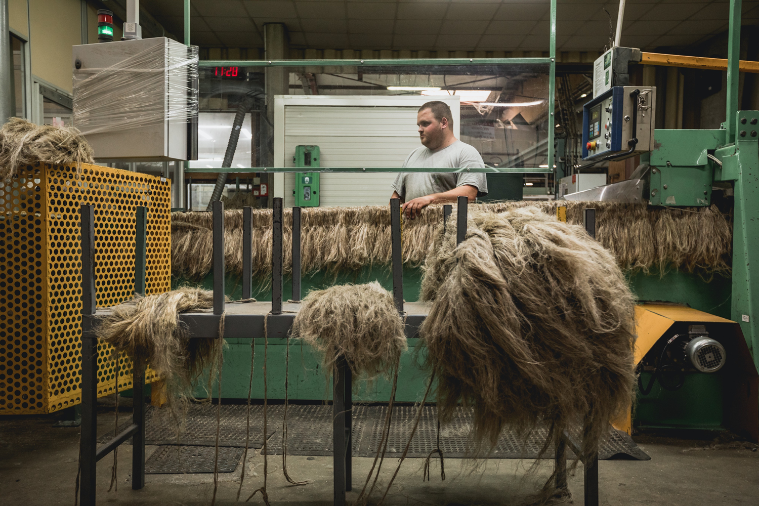 Scutching is an industrial process that consists in mechanically extracting the flax fibers from the outer shell of the stem once the latter has been stripped of its bark. It works through successive ginning, stretching, crushing, and threshing stages. Flax is a plant that does not produce any waste since scutching residues, also known as anas, are used to make boards or as bedding for animals. The scutching inaugurates a long process resulting in golden ribbons, thin as hair, which make the reputation of the Terre de Lin cooperative.