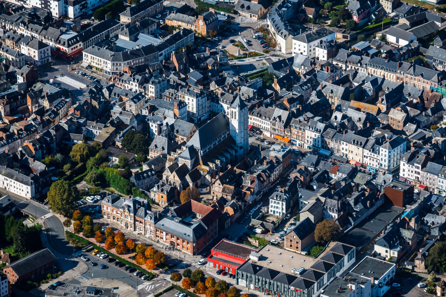 During the Second World War, Pont-Audemer suffered severe US bombardments that destroyed most of its western district, sparing the historic center. Today, the town of the Eure department still displays canals lined with typical half-timbered and brick Norman houses from the 15th and 16th centuries. Initiated in the 11th century, the Saint-Ouen church still shows its Flamboyant Gothic style. Modern works also adorn the town center, such as the lace-shaped gray and white pavement of Place du Pot d'Étain or the futuristic pink lines of Le Ciné movie theater.
