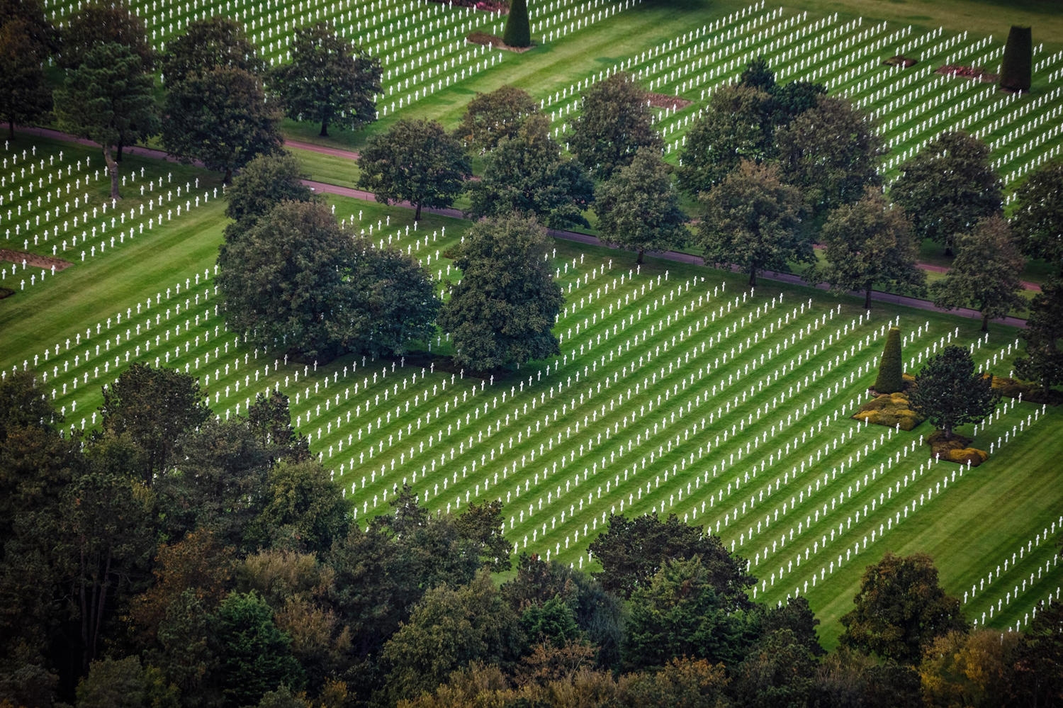 The Normandy American Cemetery and Memorial of Colleville-sur-Mer is mostly dedicated to the American soldiers who died from the Normandy Landings on June 6, 1944, until the end of the Battle of Normandy in August 1944. Exactly 9,387 soldiers are buried there, including five Canadians, one Mexican, one English, and one Scottish. France granted a perpetual concession to the USA in charge of maintaining the cemetery. However, French law still prevails on the premises.