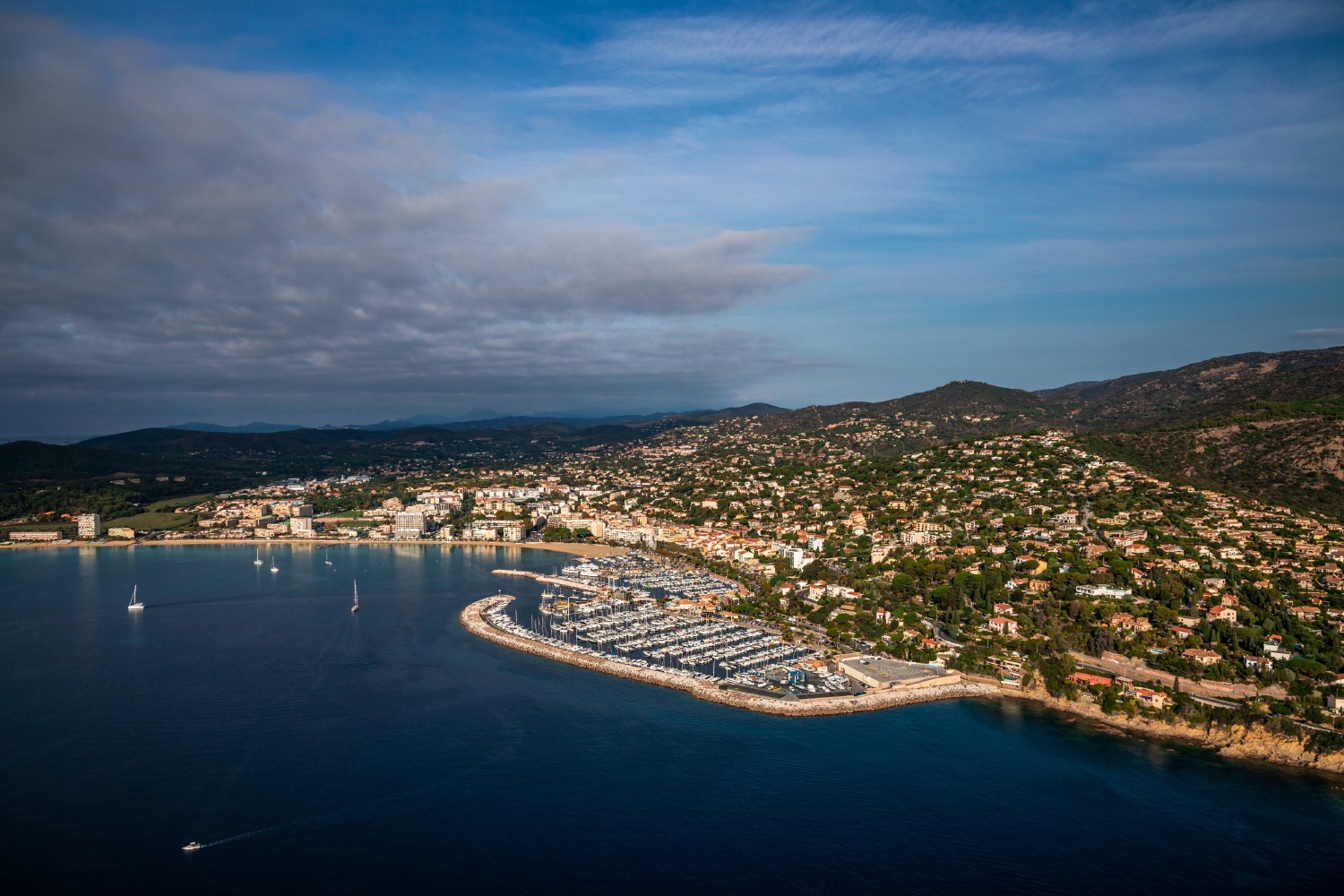 The marina of Le Lavandou is located opposite the islands of Levant and Port-Cros. It extends in a natural cove formerly equipped with a simple landing stage that fishermen once used to shelter their boats. Protected from the mistral by Cap Bénat and the easterly winds by Cap Nègre, it forms a marina made up of the historic old port, built at the end of the 19th century, to which has been added a new one enlarged between 1980 and 1983. The first quay dates from 1880, just like the first 492 ft (150 m) long jetty destroyed by the Germans on August 16, 1944.