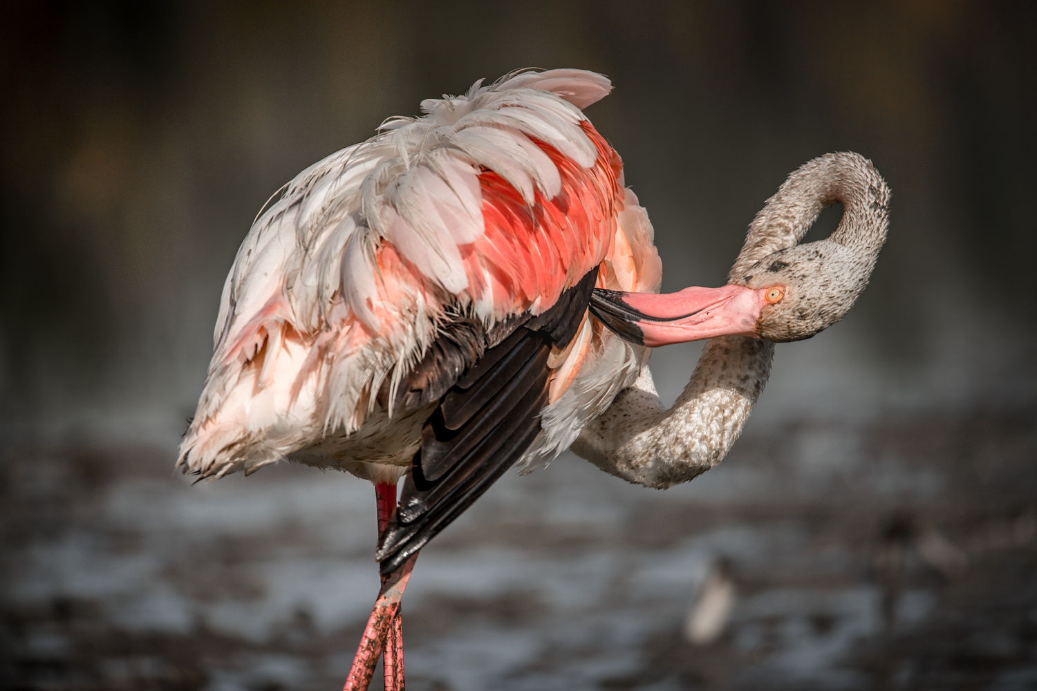 The greater flamingo (Phœnicopterus roseus) has rather long wings, the wingspan of which can reach 5.4 ft (1.65 m) in the largest males. Wide at their base and pointed at their end, they enable the flamingo to perform powerful and regular beats that propel it at speeds peaking around 37.2 mph (60 km/h) during the several hundred miles stages of the migratory flights. Slow and heavy on take-off, greater flamingos typically fly in undulating formations with their necks and legs stretched out.
