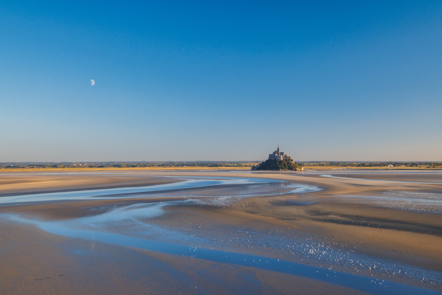 At the mouth of the Couesnon river extends the vast sandy bay of Mont-Saint-Michel. Some 3,149 ft (960 m) in circumference, the rock seems to be resting on the sand with its 17 acres (7 ha) emerged. A major spiritual site forever attached to Saint Michael, Mont-Saint-Michel has been inhabited since 709 by villagers fleeing Viking raids. The bay and the architectural ensemble of Mont-Saint-Michel have been listed as a UNESCO World Heritage Site since 1975.