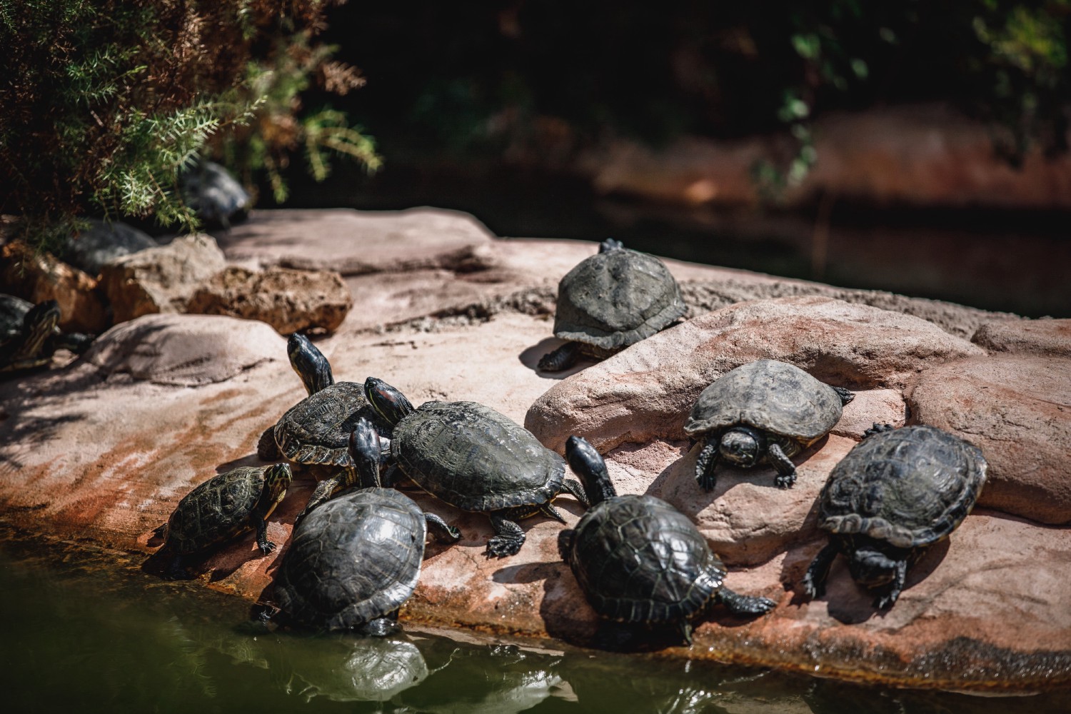 The European Pond Turtle (Emys orbicularis) is a small carnivorous turtle of about 6 inches (15 cm) recognizable by its dark, smooth, and rather flat shell sometimes punctuated with yellow and its webbed legs with strong claws. It is the only species of freshwater turtle in mainland France where its populations are mainly concentrated in the southwest and the southeast, as here in the Var department. Particularly attached to aquatic environments (ponds, old gravel pits, streams, etc.), the European Pond Turtle comes back to land to find spawning sites.