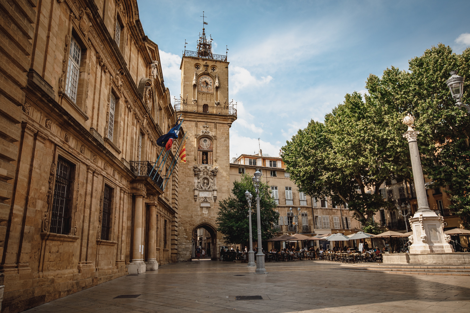 Since the 14th century, the town hall of Aix-en-Provence has been adjoining the city's belfry or clock tower. It was rebuilt between 1655 and 1678 based on plans by the architect Pierre Pavillon, assisted by the sculptors Jean-Claude Rambot and Jacques Fossé. The town hall's facade, inspired by Italian palaces, borders one side of the Place de l'Hôtel de Ville and faces a monumental fountain decorated by Jean-Pancrace Chastel and surmounted by a Roman column from the former count's palace. Aix-en-Provence's flower market is held three times a week outside its doors.