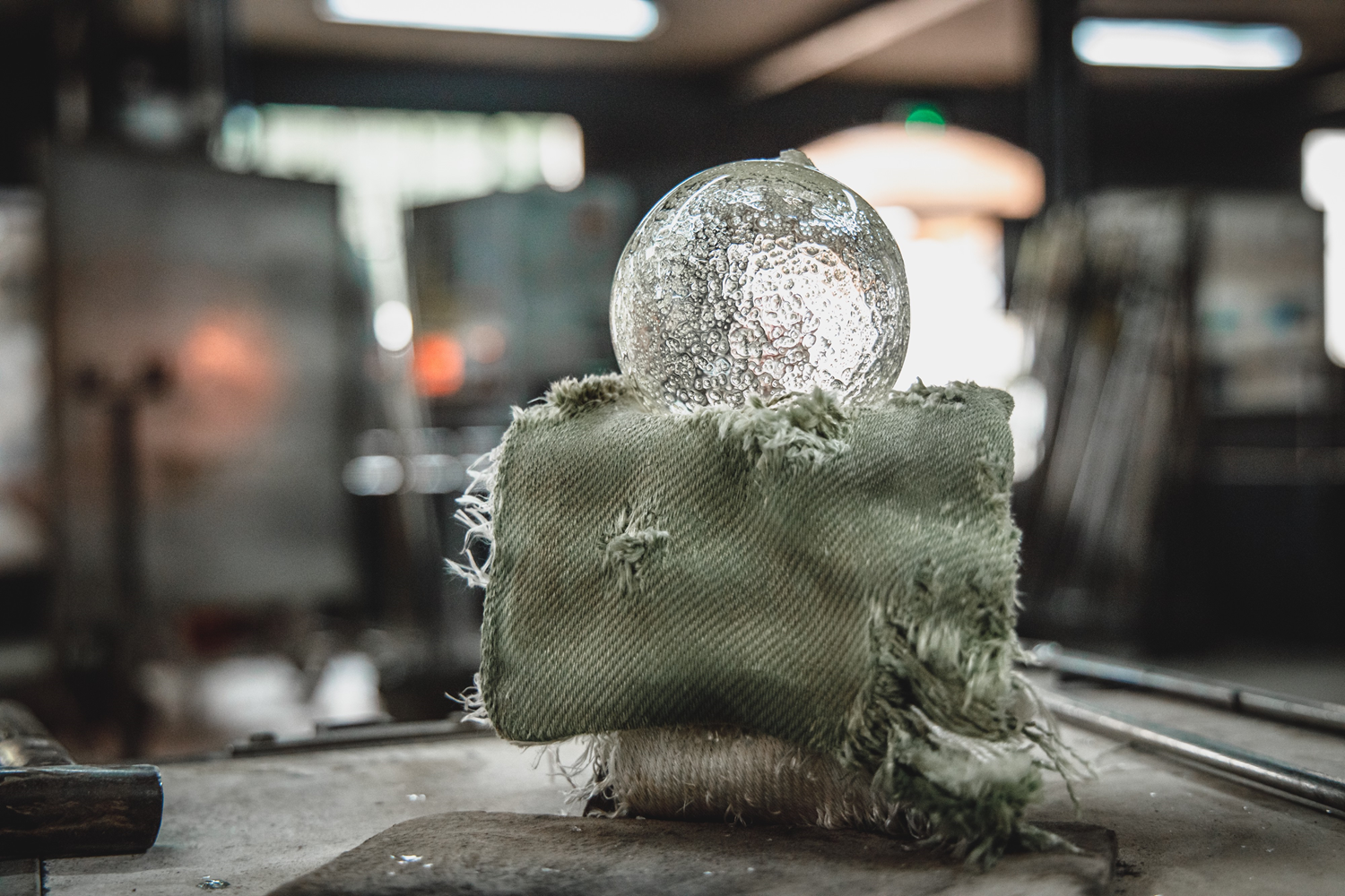 In 1956, the Verrerie de Biot turned a flaw of poorly refined glass into its trademark by deliberately creating gas bubbles in the mass of molten glass. It then transformed the bubbled glass into a decoration process by developing the technique and the machine allowing the harmonious distribution of baking soda powder on the hot glass ball while it is being shaped. Such a process made it possible to trap the bubbles between two layers of glass.