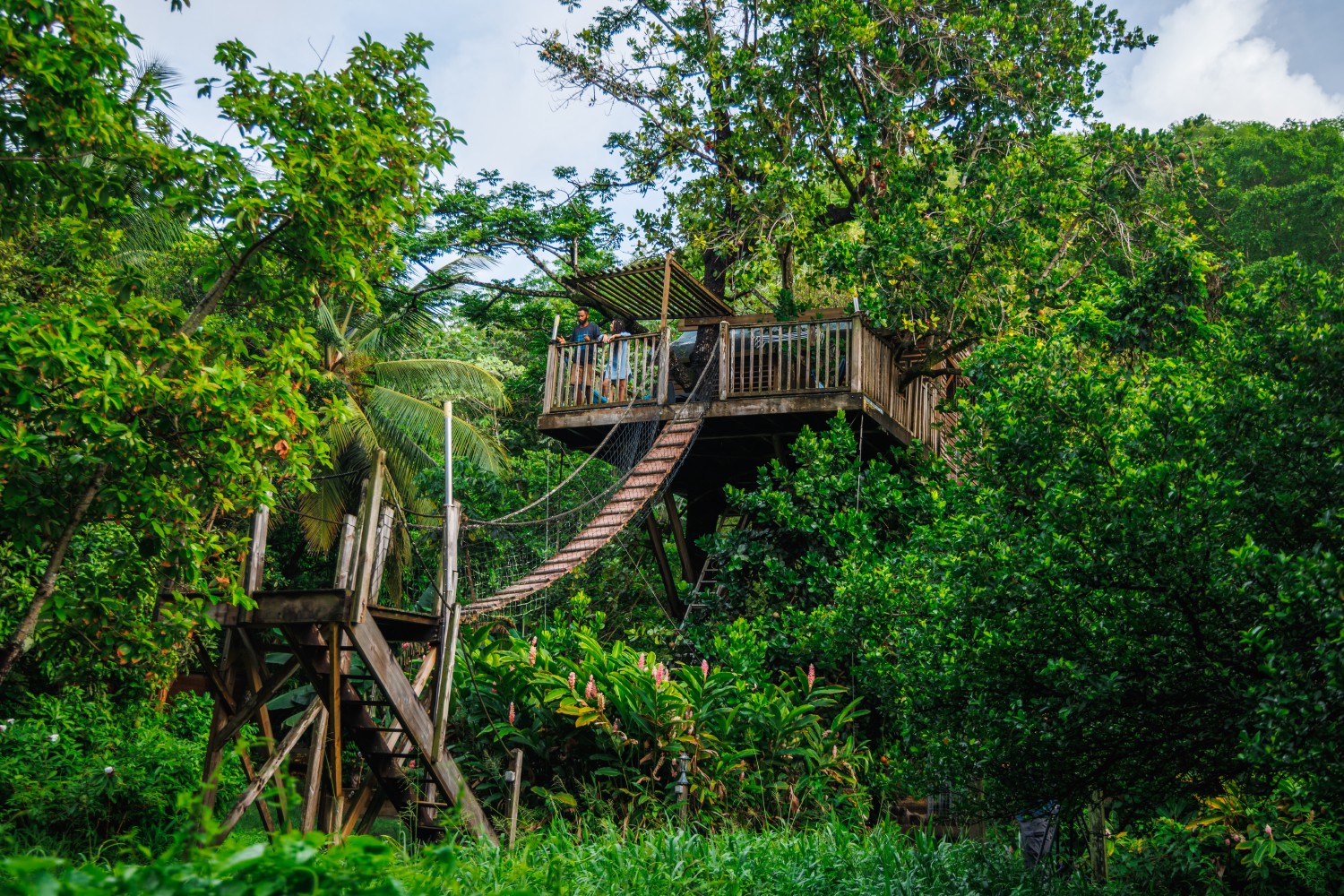 This Bungal'arbre is the attraction of the Domaine de Robinson, a holiday village located on the seafront in the south-west of Martinique on the edge of the beach of Anse Noire, three miles (5 km) from the center of Les Anses-d'Arlet. Implanted on one acre (0.45 ha) in the heart of tropical vegetation, the Domaine de Robinson consists of eight accommodations (four bungalows and three studios for two people as well as a bigbung for four people) developed and decorated using natural and local materials (coconut, sand, bamboo, etc.). Unique in its kind, the Bungal'arbre is the only bungalow built in the trees between the branches of an apricot tree. It is accessible by a rope bridge.