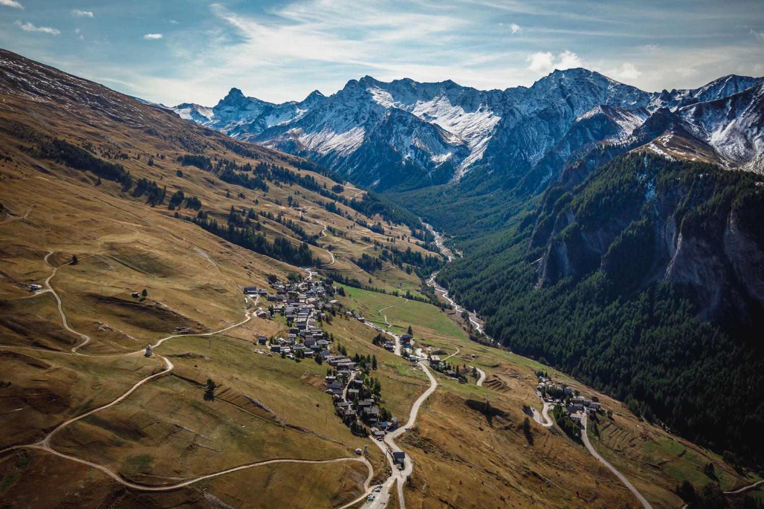 Located in the Queyras massif on the mountainside at 6,699 ft (2,042 m) above sea level, the village of Saint-Véran dominates the valley of the Aigue Blanche torrent, also called Rif de la Blanche, at 5,905 ft (1,800 m) of altitude. This torrent travels 8.2 mi (13.3 km) on the French territory and crosses five municipalities of the Hautes-Alpes department: Ceillac, Château-Ville-Vieille, Molines-en-Queyras, and Saint-Véran.