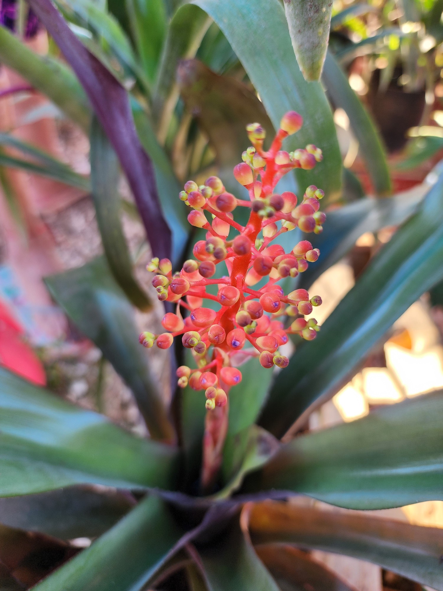 Aechmea miniata es una especie de planta con flores en la familia Bromeliaceae, originaria de los bosques húmedos del este de Brasil. Especie herbácea perennifolia, monocárpica (fructifica una sola vez y luego muere), acaula, epífita, alta con la inflorescencia de 30-40 cm, presenta una roseta en forma de embudo de unos 40 cm de diámetro con hojas de color verde oliva. Las flores miden 15 mm de largo con ovario y sépalos rojo coral y pétalos azules, tendiendo posteriormente al rojo.