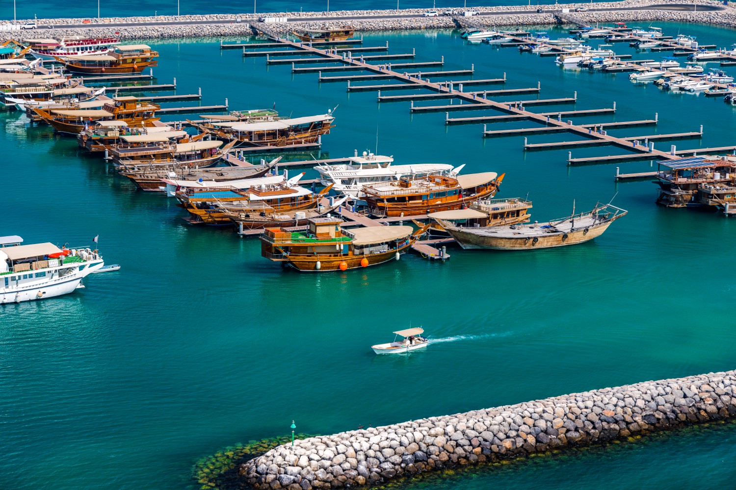 The end of the pearl industry in the 1930s and 1940s transformed the traditional dhows moored here in the port of Al Wakrah into leisure and tourist boats. Once a year, in May, the country’s pearl fishing tradition is revived with the Senyar Pearl Diving Contest. Aboard dhows, the competitors take turns in teams of five to free dive at the bottom of the sea and collect pearl oysters. The boat that collects the most oysters wins the first prize (400,000 riyals or 110,000 dollars). The emphasis is not on the number of pearls found (the oysters are not opened) but on the quantity of oysters caught and the technique used. At the end of the day, the oysters are returned to the water to preserve the ecosystem.