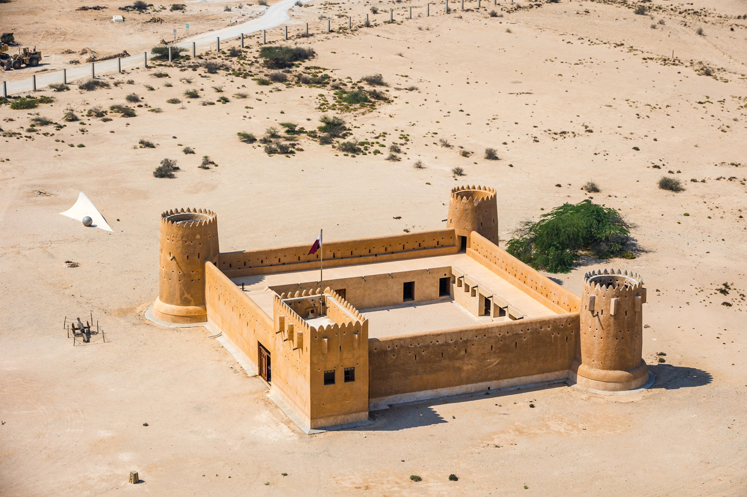 Unlike other forts located on a mountain or by the sea, Al Zubarah Fort is located in the middle of a large desert plain, about 1.5 miles (2.5 km) from the northwest coast of Qatar. Its high towers allow it to keep an eye on the surrounding area for miles. It is now part of the eponymous archaeological site, whose remains of houses, masjids (mosques), madabis (date presses) and other fortified enclosures cover an area of 60 hectares. Built in 1938, Al Zubarah Fort was assigned to the Coast Guard, followed by the military and police. Today it is a museum and exhibition centre.