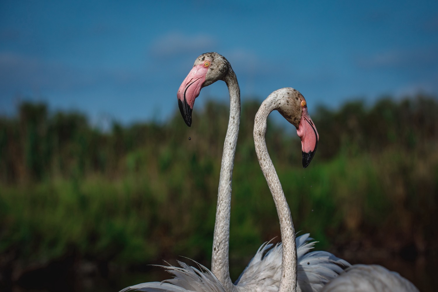 Unlike the well-pronounced sexual dimorphism characteristic of many species of birds, it is difficult to distinguish males from females in greater flamingos (Phœnicopterus roseus). The two have the exact same plumage, perform the rituals of the courtship displays together, build the nests, incubate the eggs, and feed the young. Only the slightly larger size in males can sometimes help differentiate them.