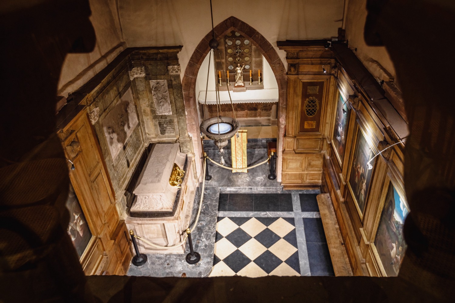 The chapel is one of the oldest places in the Mont Sainte-Odile convent. It consists of a Romanesque nave from the 11th and 12th centuries and a Gothic choir from the 14th century. In 1937, Robert Danis decided to modify Sainte Odile's sarcophagus. Today it is made up of an assemblage of ancient and modern elements. The original sarcophagus is visible through three openings. A bronze plaque mentions: “Sepulcrum Sanctae Odiliae Virginis” (Sepulcher of the virgin Sainte Odile). The altar of the chapel rises on a stone slab that used to stand at the front of the tomb. An alabaster window now replaces the former neo-Romanesque stained glass window.