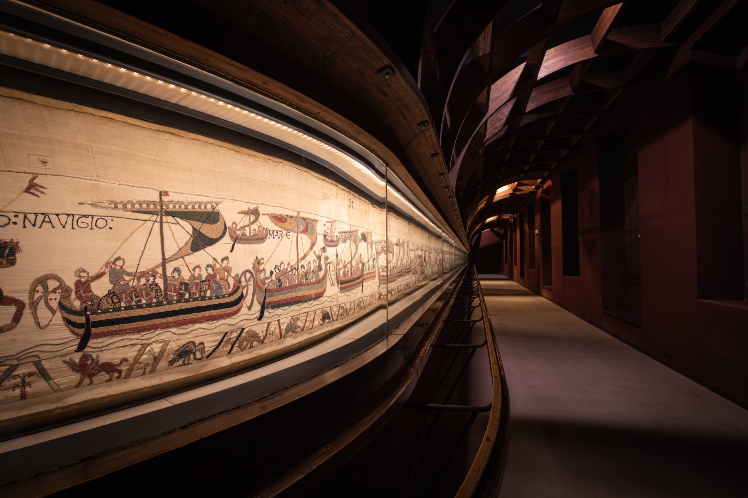 Despite its name, the Bayeux Tapestry, about 224 ft (68.3 m) long and 27.5 inches (70 cm) wide, is, in fact, a narrative embroidery. Embroidered with images and inscriptions, it consists of nine linen panels connected to each other. The consistency of the line of the woolen thread reveals the use of a guide, perhaps a drawing, on the canvas. Unlike embroidery, a tapestry sees its decoration resulting from the weaving of threads at right angles, the image and the fabric taking shape simultaneously.