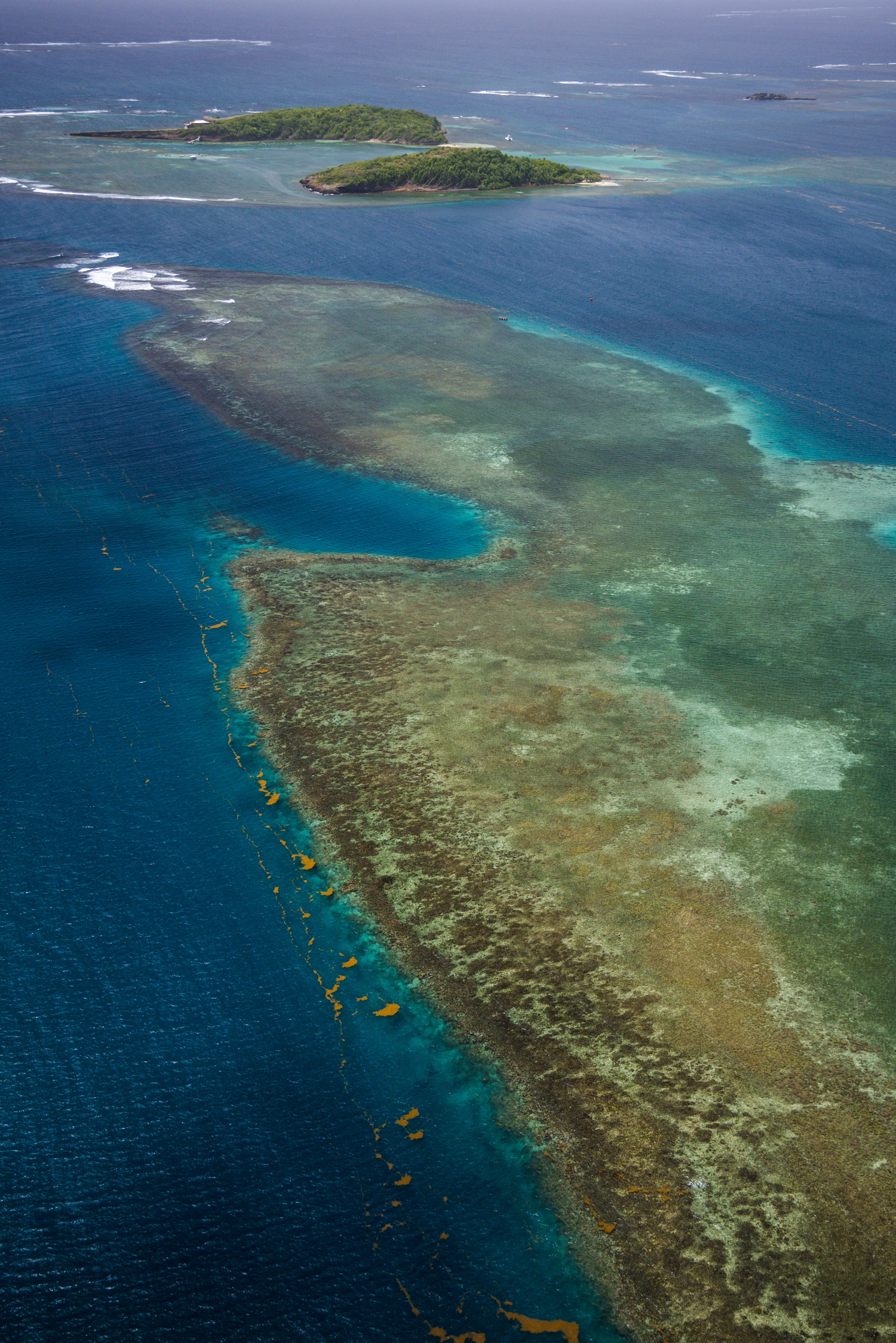 The three types of coral flats in the Martinican maritime area extend over a length of 43 miles (70 km) and cover an area of approximately 122 square miles (197 km²). The richest in fauna and flora are the fringing reefs of the southern part of the island, between the Rocher du Diamant and the Salines. The most developed are the barrier reefs that border the eastern fringe of Martinique over 15 miles (25 km) and individualize lagoons 1.8 to 5 miles (3 to 8 km) wide. Apart from these reefs are reef formations of non-bioconstructive algal origin. They mainly occupy the steep and rocky shores of the Caribbean coast of the island from a depth of 33 ft (10 m).