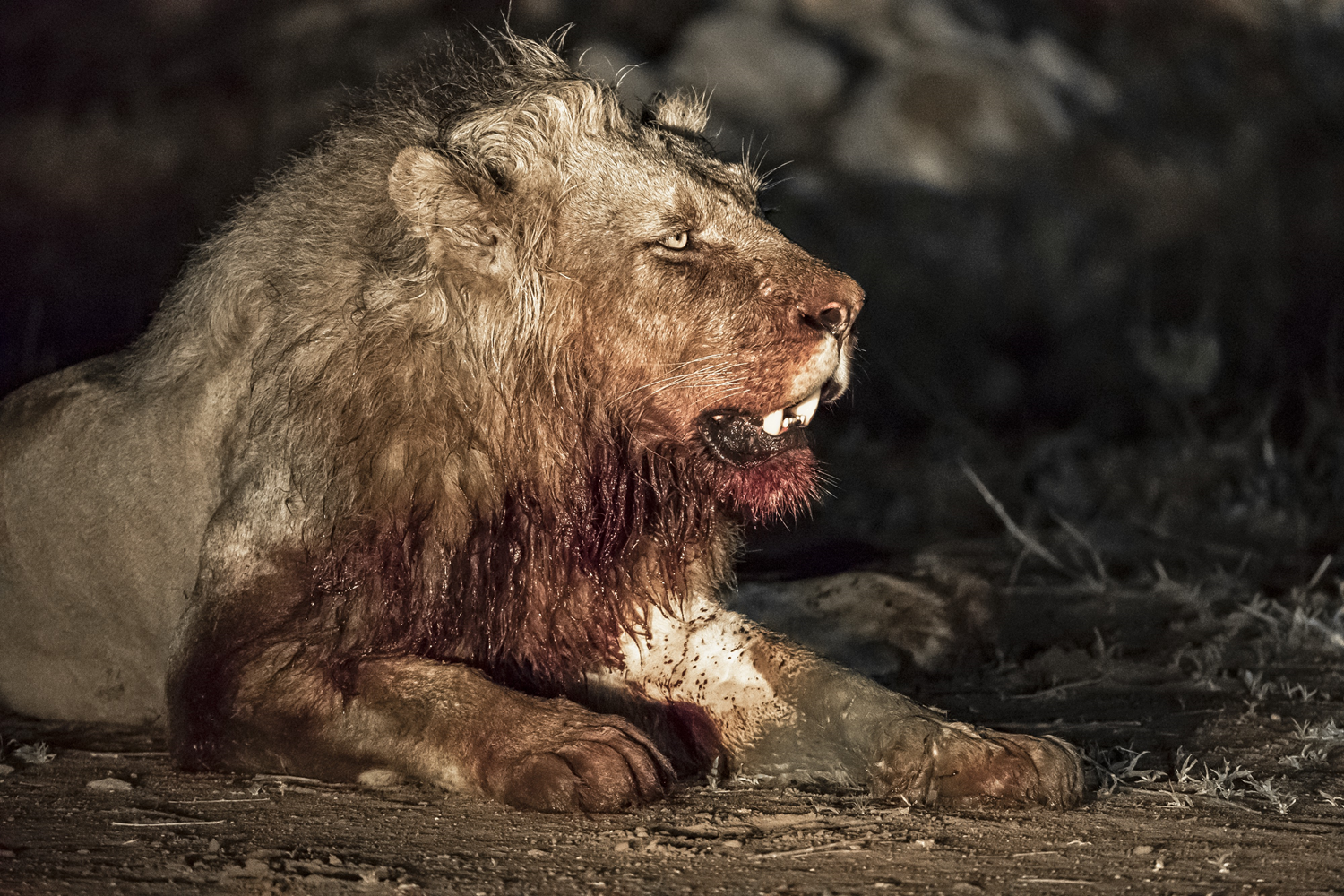 This male is part of a coalition of six lions that has just killed a buffalo in the middle of the night. After eating, he moves away a few steps from the carcass, and lays down, exhausted and still recovering from the hunt, but full.