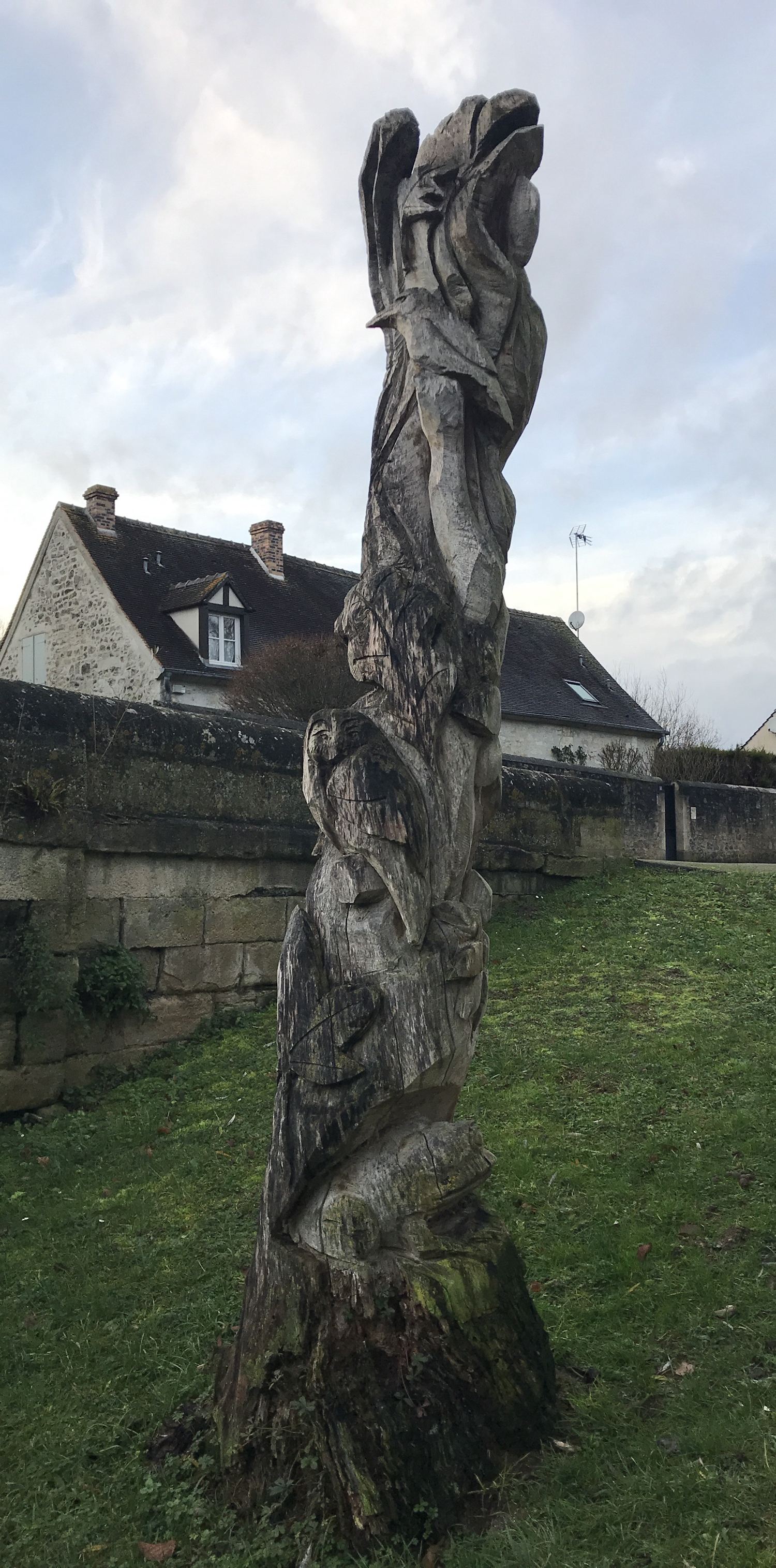 Arbre mort sculpté façon totem le long de la voie verte. Sur cette face, l’attisa sculpté des animaux. On reconnaît en bas une grenouille, et en haut un oiseau.