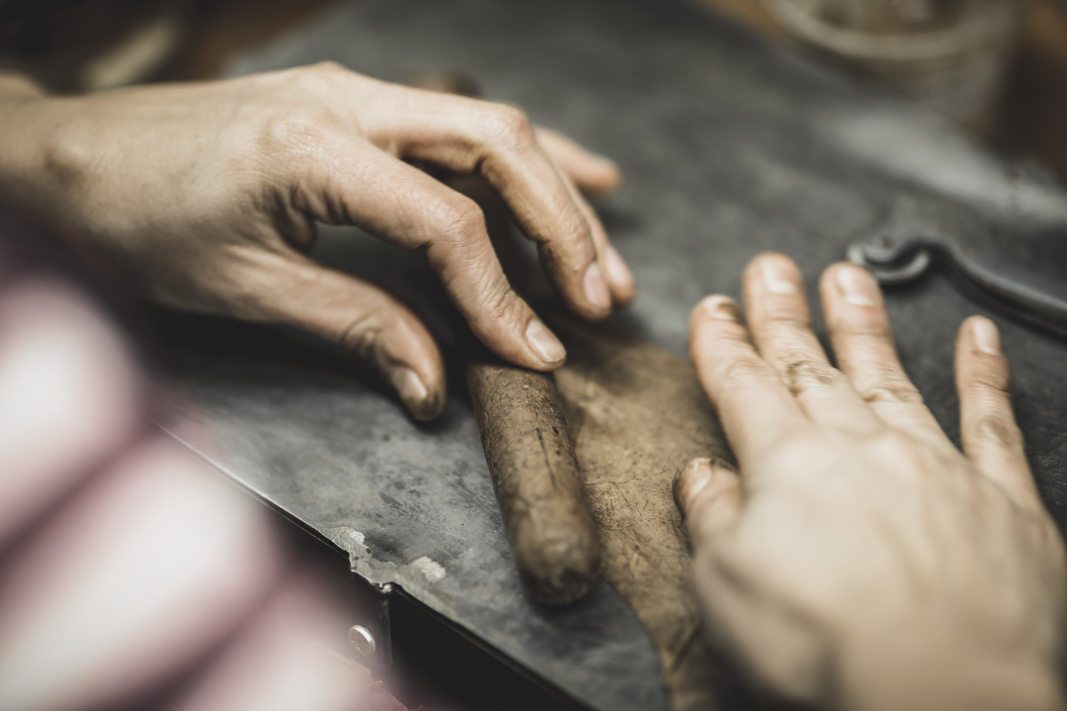 After removing the roll from the mold, the cigar roller cuts off the leaves protruding from the head and foot, before winding it in the wrapper leaf. This wrapper leaf is cut with a special half-moon shaped knife, called the chaveta, and is wrapped around the cigar.