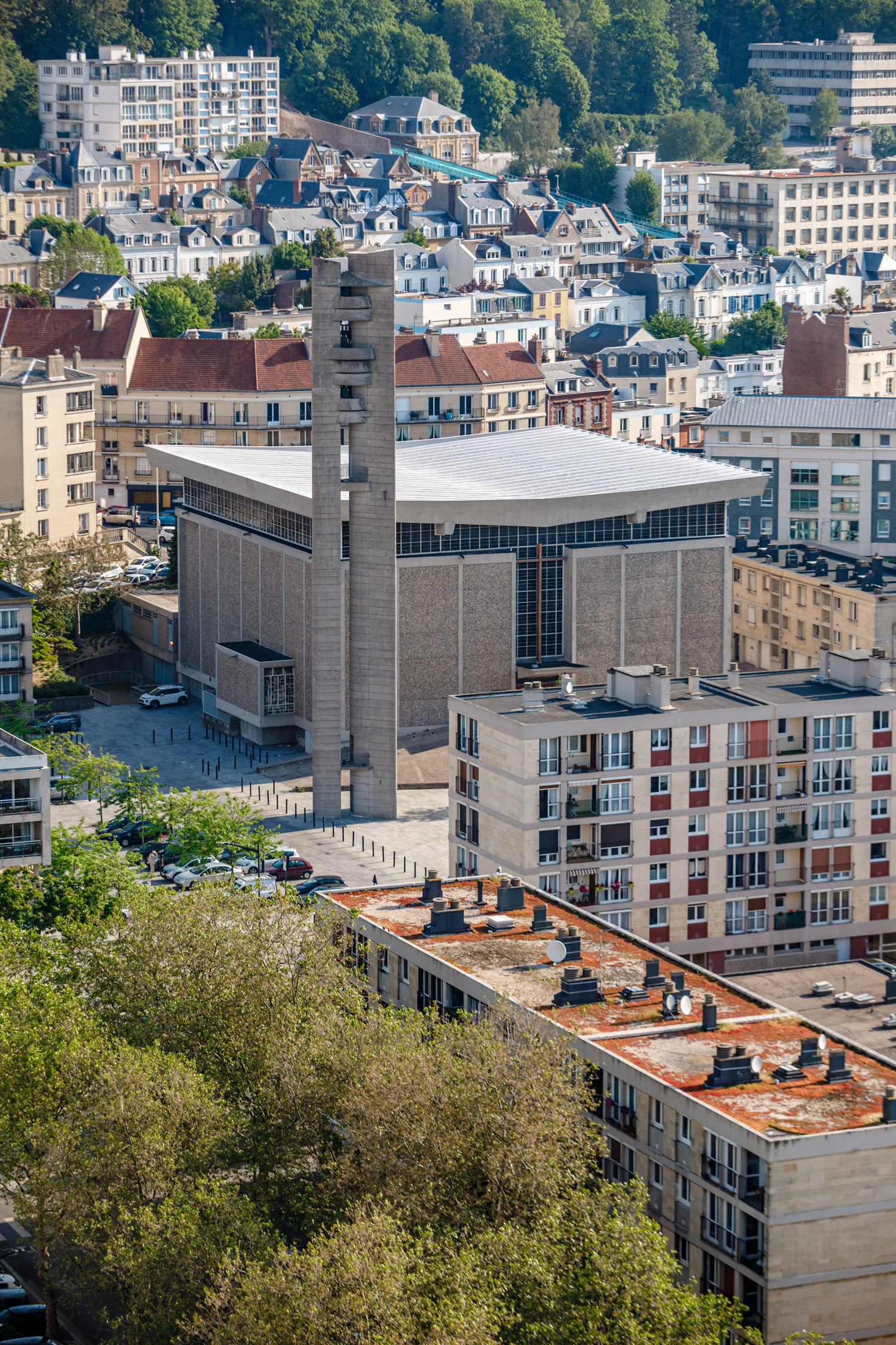 The construction of Saint-Michel Church in Le Havre was completed in 1964. It replaced the town's first church, which dated from 1661, and was designed by Henri Colboc, a local architect winner of the Rome Grand Prix. The 154 ft high (47 m) bell tower of the church symbolizes a candle in the heart of an open book when the building is seen from the sky. The interior of Saint-Michel Church features a set of glass roofs created by master glassmaker Boutzen.