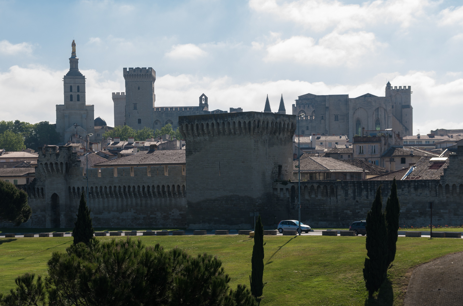 Les remparts et le clocher de la cathédrale Notre-Dame-des-Doms d'Avignon et le palais des papes.