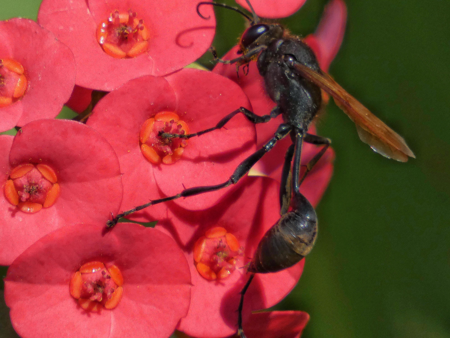 Avispa Sceliphron fuscum de Madagascar (sphecidae sp.) sobre flores de la euphorbia milii