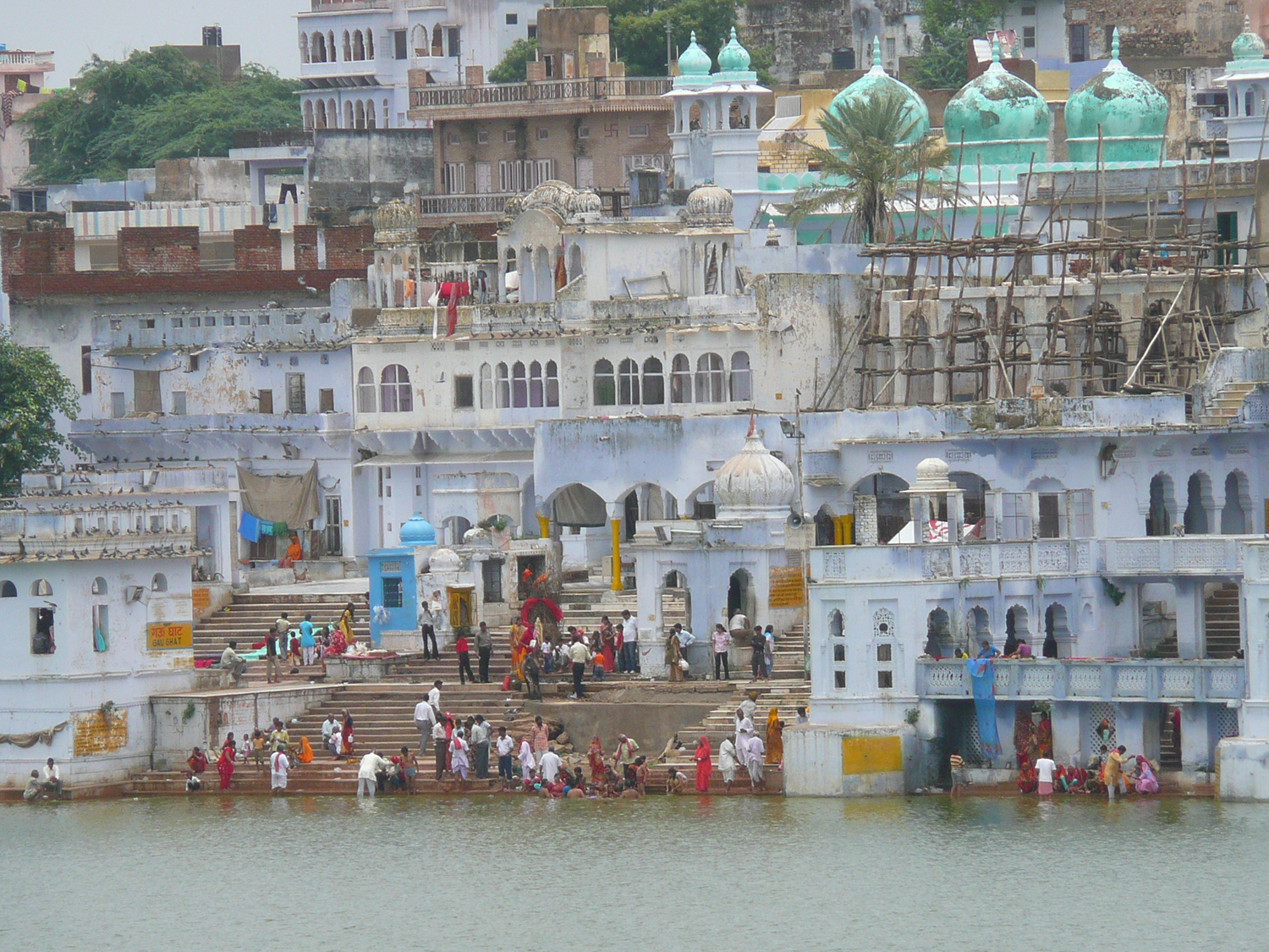 Pushkar, située sur les rives du lac Pushkar, est un grand lieu de pèlerinage pour l'hindouisme. Cinquante-deux ghats permettent aux pèlerins de descendre au niveau du lac pour se baigner dans les eaux sacrées.