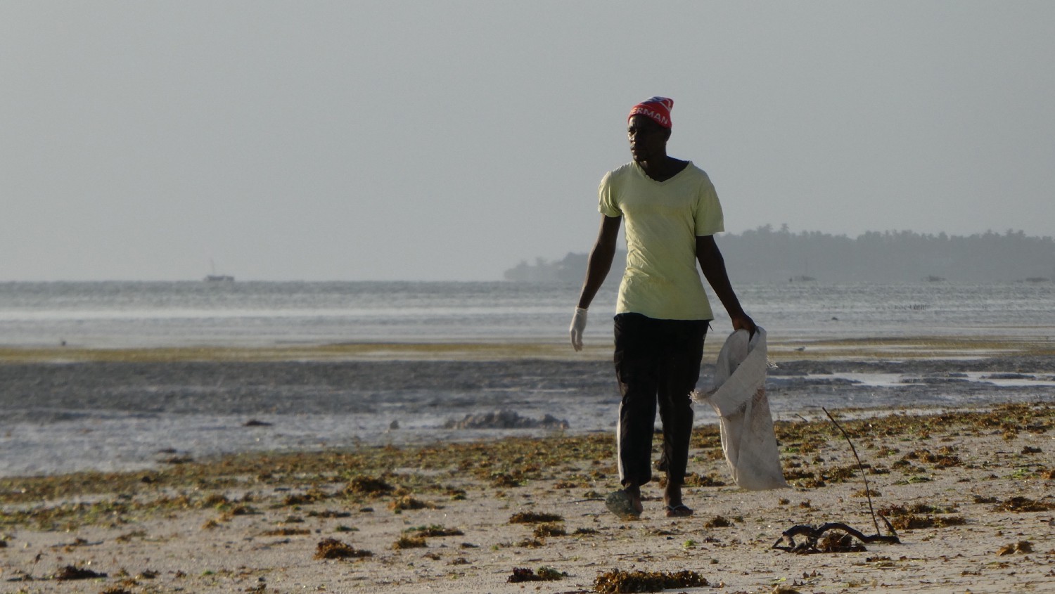 A local worker is removing plastic trash from the beach on an early summer morning in Zanzibar.
