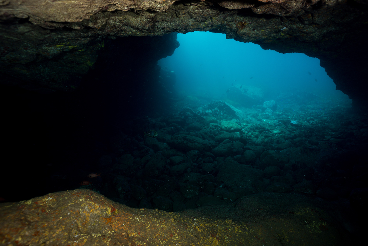 The seabed of the Marquesas, high islands of volcanic origin, are full of underwater caves with original configurations. There are large dark cavities up to 328ft (100m) long, narrower and silted caves, tunnels, partially lit open arches. In all cases, there is a decrease in the apparent biodiversity from the entrance, which still benefits from light, to the bottom of the cave where the darkness is total.