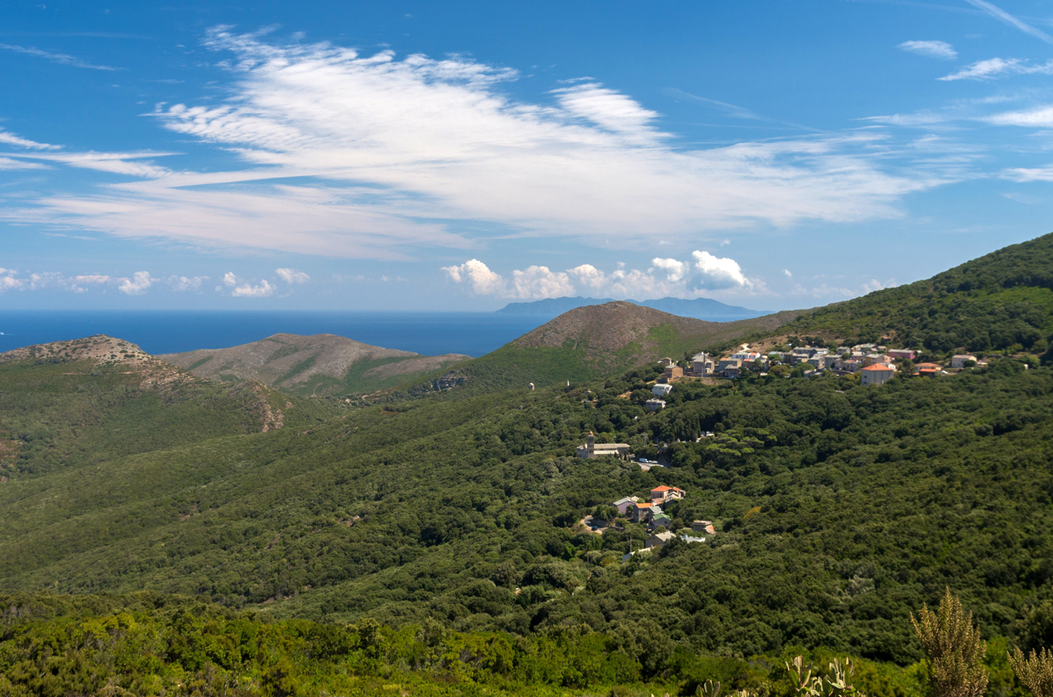 Le village de Botticella et le couvent Santa Maria. En arrière plan l'île d'Elbe.