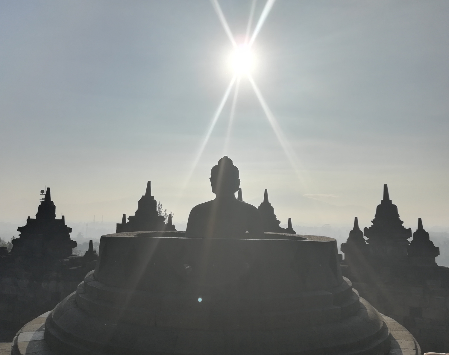 Lever de soleil au temple Borobudur, capture de ce superbe moment, dans chaque cloche il y a une statue de Bouddha