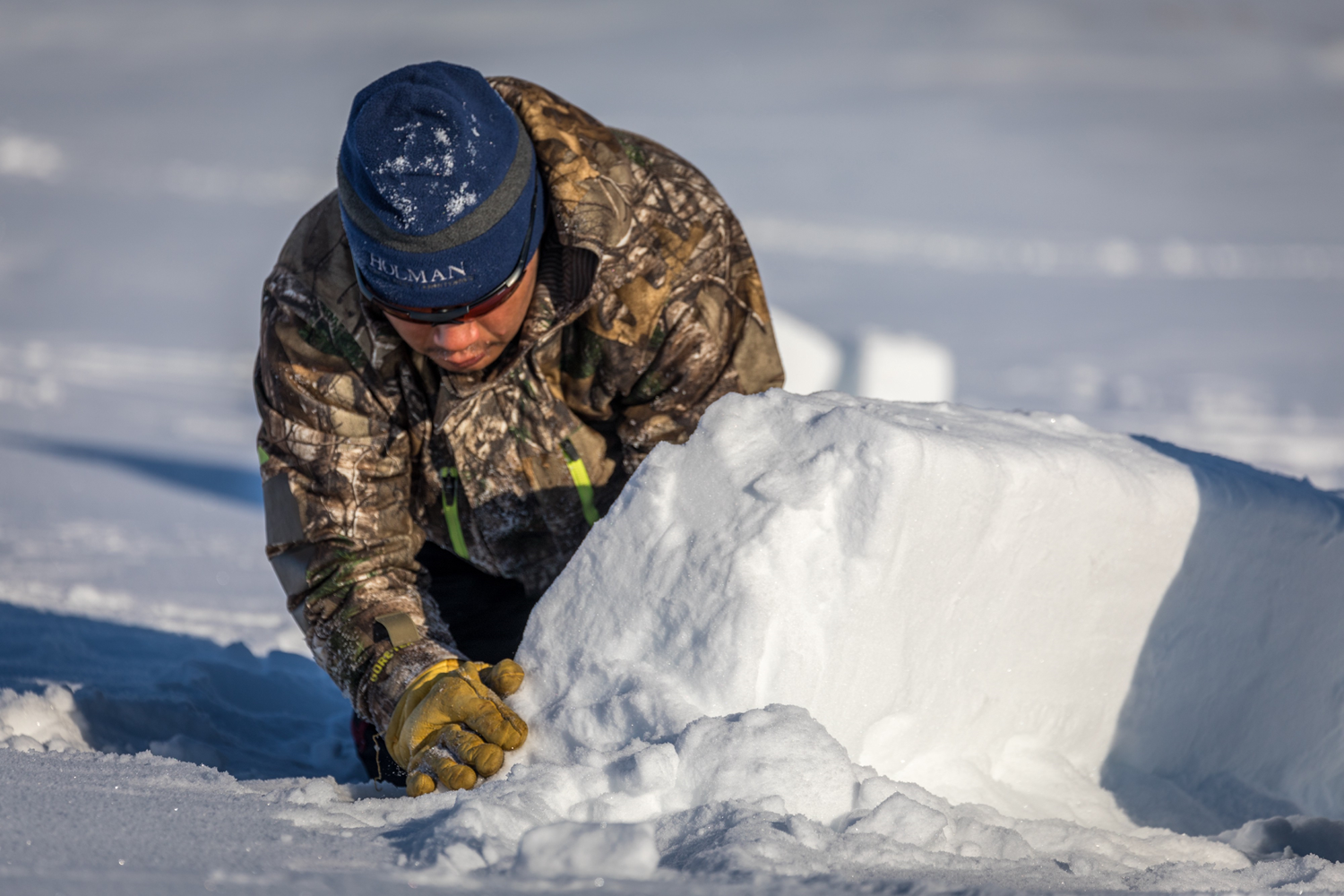 An igloo, « iglu » in Inuktitut, is a shelter built of snow, typically built when the snow can be easily compacted, and traditionally associated with people of Canada's Arctic and Greenland areas. Sometimes, a short tunnel is constructed at the entrance to reduce wind and heat loss. Beds made of ice and caribou furs can be found, uniques to Inuit culture.