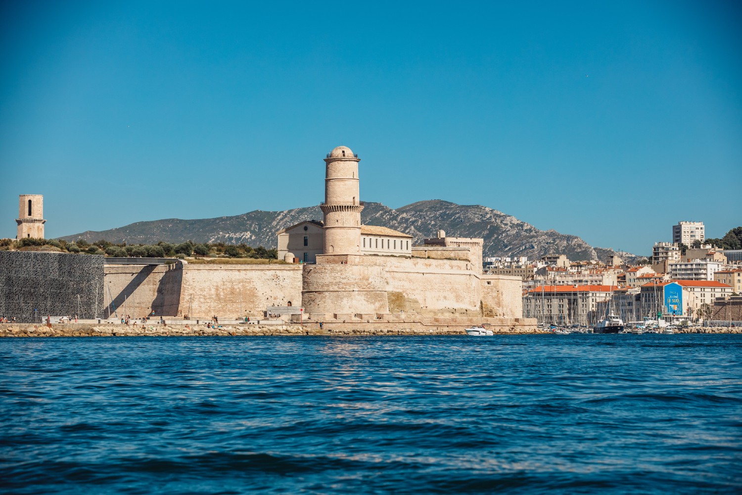 Initiated in the 12th century and completed in the 17th century, Fort Saint-Jean, which marks the entrance to the Vieux-Port (Old Port) of Marseille, first served as a departure point towards the Holy Land for the Commandery of the Hospitallers of Jerusalem. They orchestrated the addition of a church, a hospital, and the Commander's Palace. The defense of the fort was improved in the 15th century by the construction of the Tour du Roi René or Tour Carrée (Square Tower) and in the 17th century by that of the Tour du Fanal or Tour Ronde (Round Tower). Citadels were erected by Louis XIV at the same time following the rebellion of the Marseillais against the royal power. Since 2013, Fort Saint-Jean has been an integral part of the MuCEM (Musée des Civilisations de l'Europe et de la Méditerranée) to which it is connected by a 426 ft (130 m) footbridge (left).