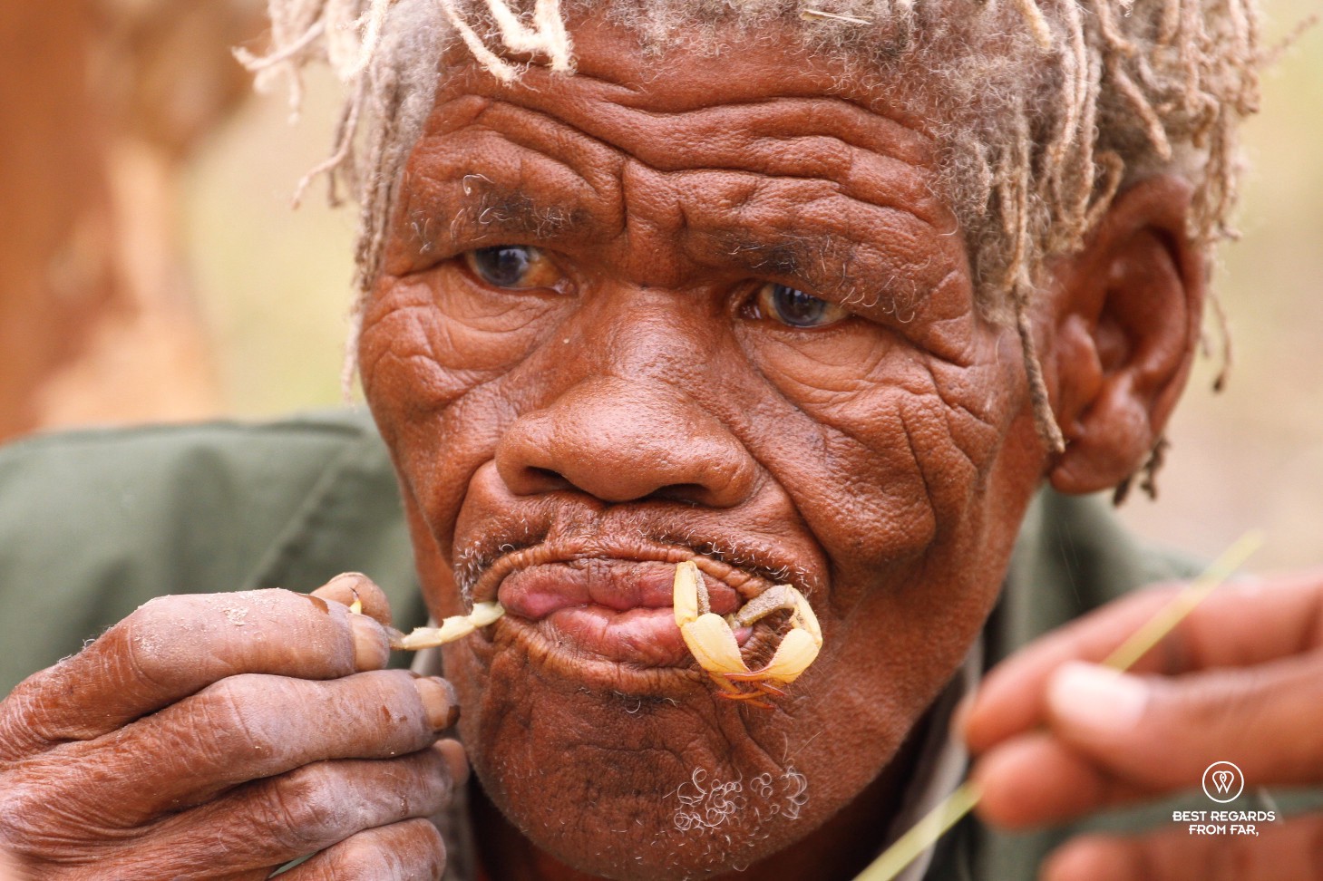 This Khoisan man shows how to clean a scorpion in the heart of the Okavango Delta, Botswana. The scorpion was still alive in his mouth and put back in the hole where he found him on a bushwalk...