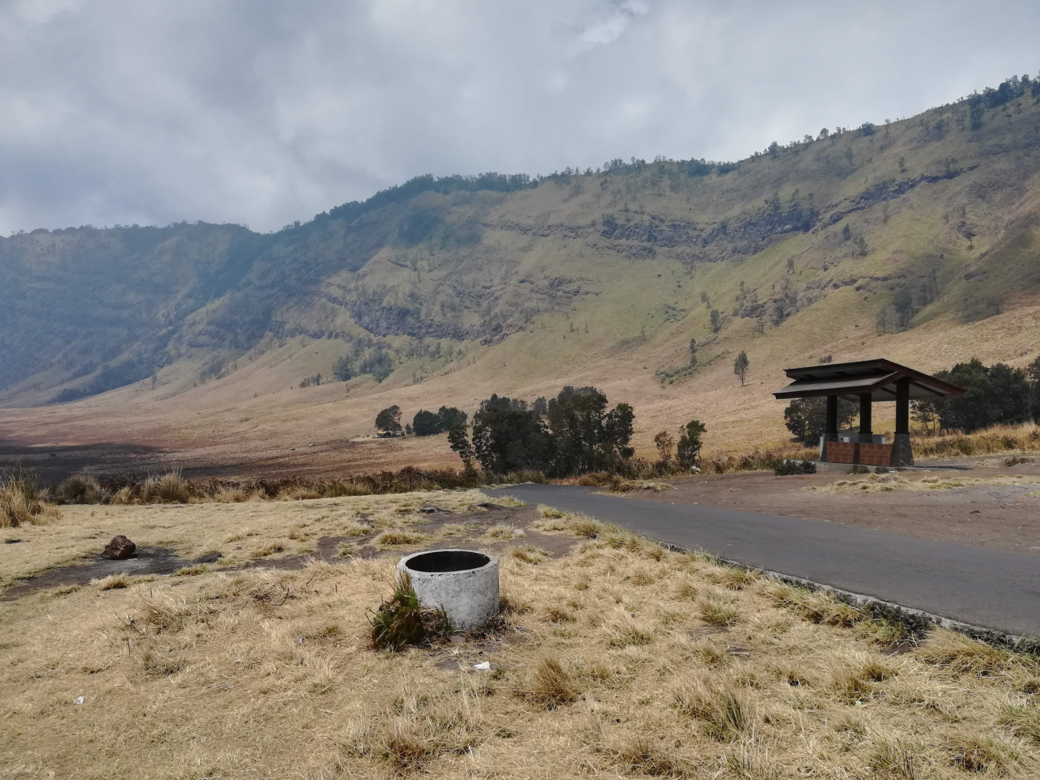 Le fond de la superbe caldera du Tengger et sa paroi formée d'une alternance de coulées laviques et de niveaux de tuf.