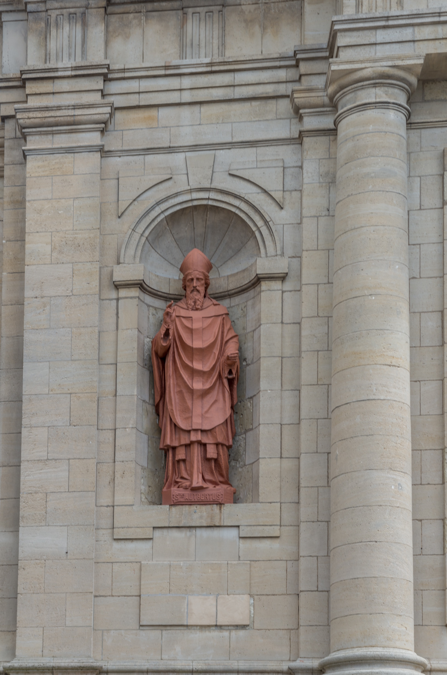 L'église Saint-Géry. Statue de Saint-Aubert (Aubertus, Autbertus) sur la façade de l'église.