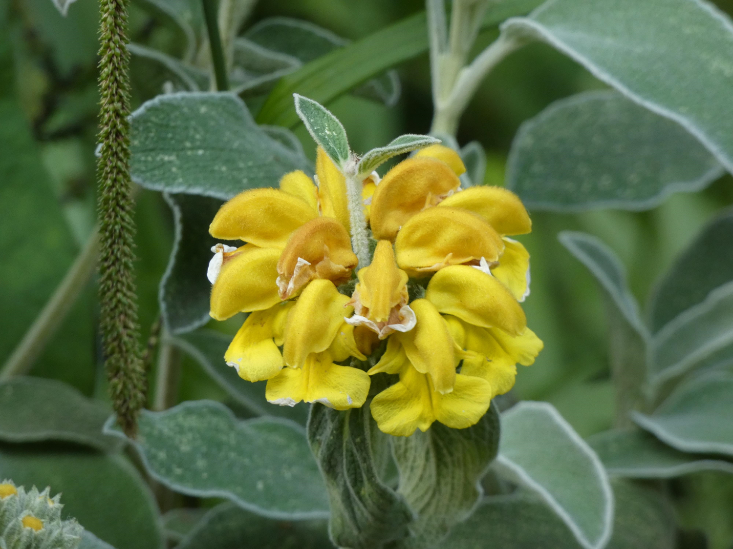 Arbusto de aspecto lanudo de hasta 150 cm de altura. Las hojas son opuestas y lanceoladas, rugosas por el haz y blanquecinas tomentosas por el reverso. Las flores son de color amarillo y se agrupan en verticilastros multiflores (14-36).